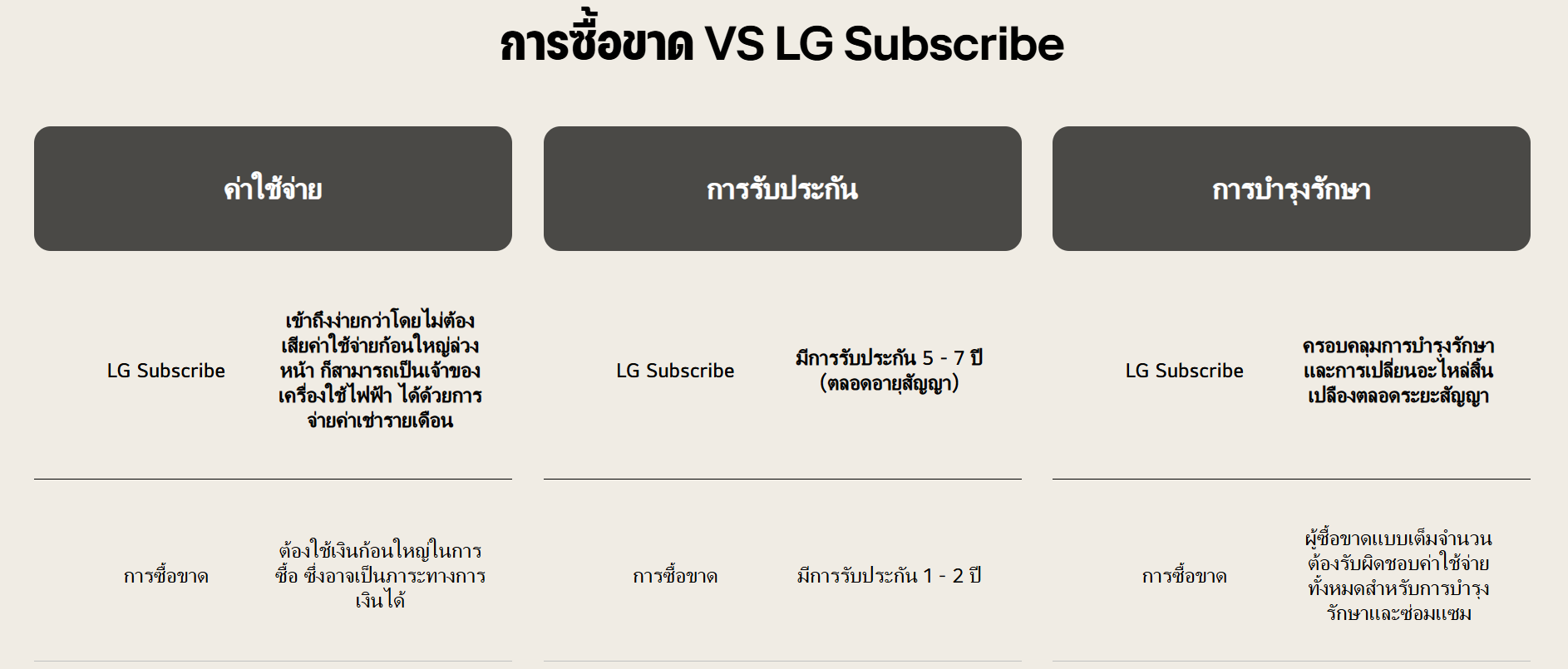 - สรุป LG Subscribe คือการเช่าซื้อเครื่องใช้ไฟฟ้าแบบผ่อนยอดน้อย ระยะยาว พร้อมทีมช่างดูแลตลอดอายุสัญญา และการรับประกันที่เพิ่มขึ้น