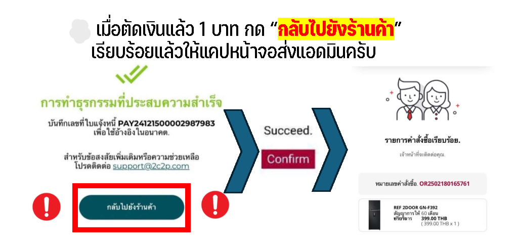 - เมื่อลูกค้าทำสัญญาเรียบร้อยแล้ว จะขึ้นให้กดกลับไปยังร้านค้า ต้องรีบแจ้งให้ลูกค้ากด มิเช่นนั้นออเดอร์อาจไม่เข้า กลับไปยังร้านค้า > Confirm > แคปหน้าจอ (ให้ดูคลิปอธิบายตามข้อ 2)