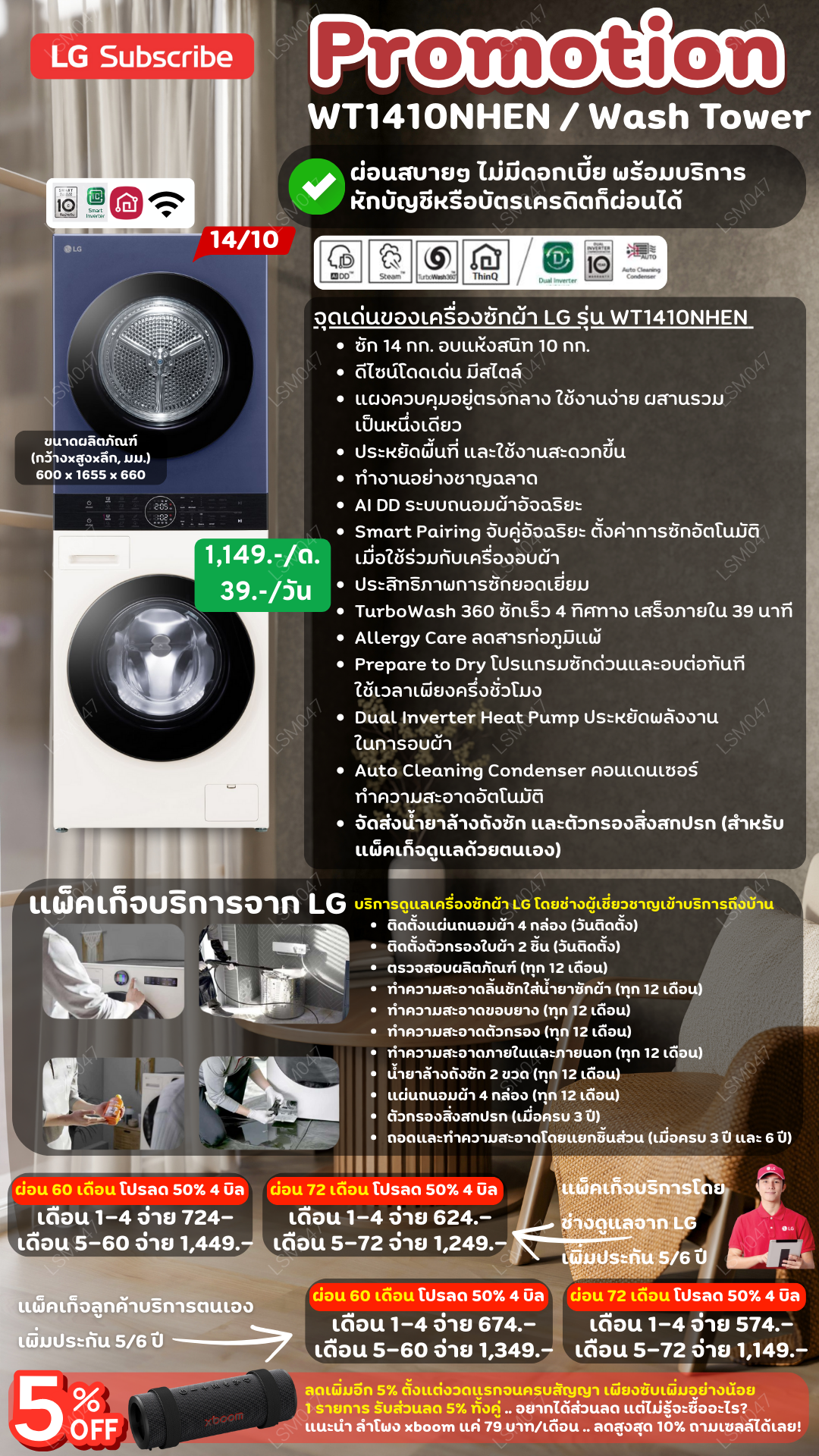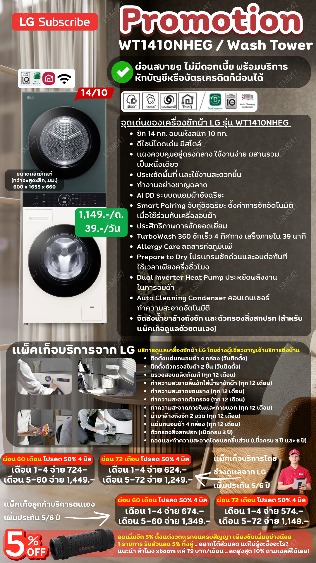 ค่างวดเริ่มต้นเพียง 4xx - 6xx บาทต่อเดือน อัตราดอกเบี้ย 0% นานสูงสุด 60 เดือน รองรับบัตรเครดิตที่วงเงินเต็มโดยไม่มีการปฏิเสธ ขยายระยะเวลาการรับประกันจาก 1 ปี เป็น 5-7 ปี บริการซ่อมแซมเครื่องโดยไม่มีค่าใช้จ่าย ฟรีค่าแรงและอะไหล่แท้ 100% ไม่มีค่าใช้จ่ายเพิ่มเติมในอนาคต เดือนแรกสามารถใช้งานได้โดยไม่มีค่าใช้จ่าย บริการติดตั้งฟรีโดยช่างจาก LG สิทธิพิเศษเพิ่มเติมอีกเพียบ ดูเพิ่มเติมการผ่อนรายเดือน