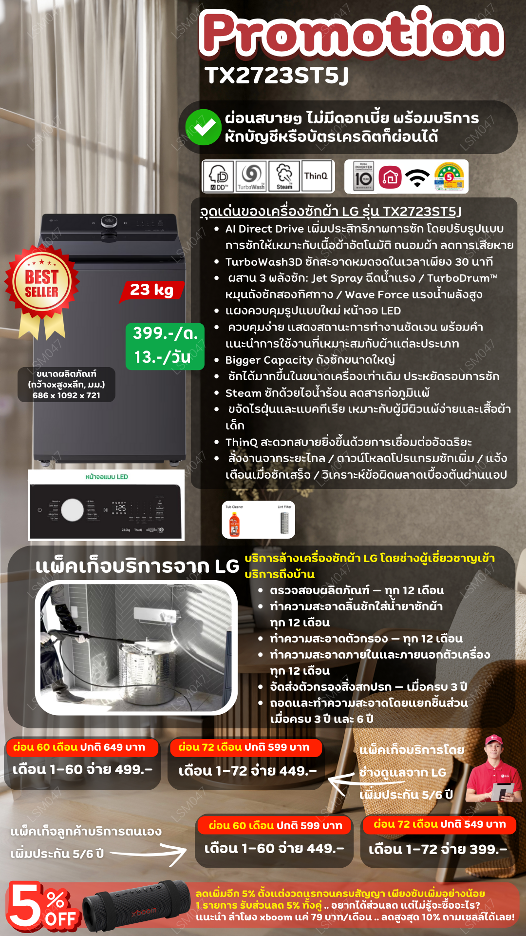 ค่างวดเริ่มต้นเพียง 4xx - 6xx บาทต่อเดือน อัตราดอกเบี้ย 0% นานสูงสุด 60 เดือน รองรับบัตรเครดิตที่วงเงินเต็มโดยไม่มีการปฏิเสธ ขยายระยะเวลาการรับประกันจาก 1 ปี เป็น 5-7 ปี บริการซ่อมแซมเครื่องโดยไม่มีค่าใช้จ่าย ฟรีค่าแรงและอะไหล่แท้ 100% ไม่มีค่าใช้จ่ายเพิ่มเติมในอนาคต เดือนแรกสามารถใช้งานได้โดยไม่มีค่าใช้จ่าย บริการติดตั้งฟรีโดยช่างจาก LG สิทธิพิเศษเพิ่มเติมอีกเพียบ ดูเพิ่มเติมการผ่อนรายเดือน
