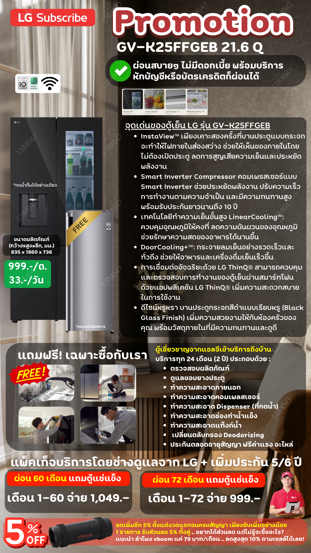 ตู้เย็น LG Multi-Door รุ่น GV-K25FFGEB มีฟังก์ชัน InstaView เคาะสองครั้งเพื่อดูด้านในโดยไม่ต้องเปิดประตู, ระบบควบคุมความเย็น LinearCooling และ DoorCooling ที่ช่วยรักษาความสดของอาหารได้นาน, พร้อมคอมเพรสเซอร์ Smart Inverter ประหยัดพลังงานและรองรับการควบคุมผ่าน LG ThinQ