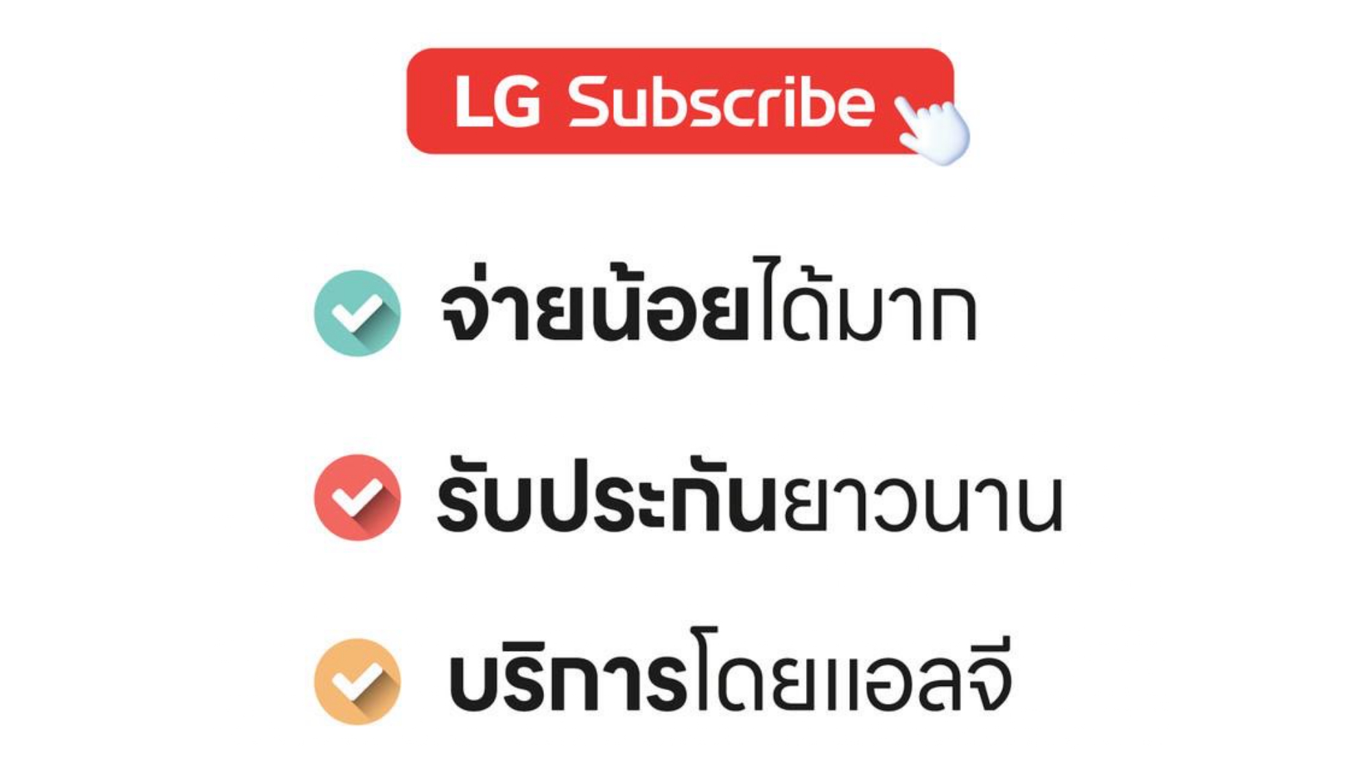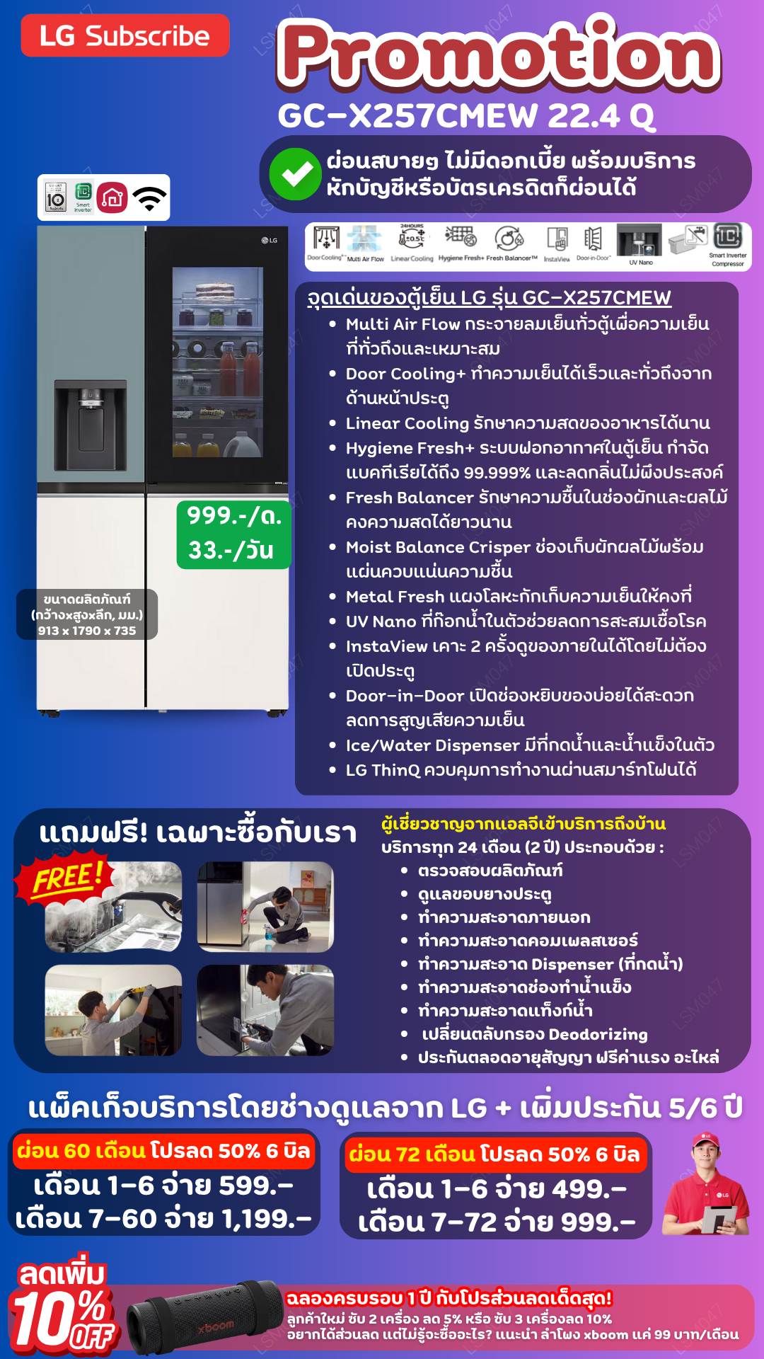 ค่างวดเริ่มต้นเพียง 4xx - 6xx บาทต่อเดือน อัตราดอกเบี้ย 0% นานสูงสุด 60 เดือน รองรับบัตรเครดิตที่วงเงินเต็มโดยไม่มีการปฏิเสธ ขยายระยะเวลาการรับประกันจาก 1 ปี เป็น 5-7 ปี บริการซ่อมแซมเครื่องโดยไม่มีค่าใช้จ่าย ฟรีค่าแรงและอะไหล่แท้ 100% ไม่มีค่าใช้จ่ายเพิ่มเติมในอนาคต เดือนแรกสามารถใช้งานได้โดยไม่มีค่าใช้จ่าย บริการติดตั้งฟรีโดยช่างจาก LG สิทธิพิเศษเพิ่มเติมอีกเพียบ ดูเพิ่มเติมการผ่อนรายเดือน