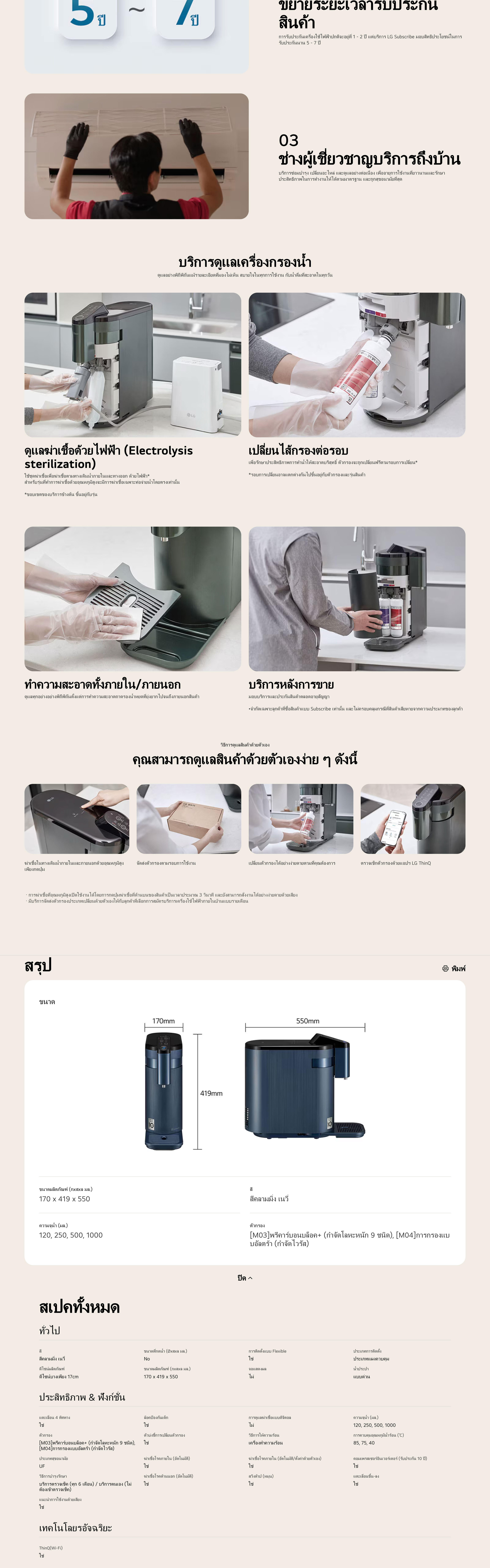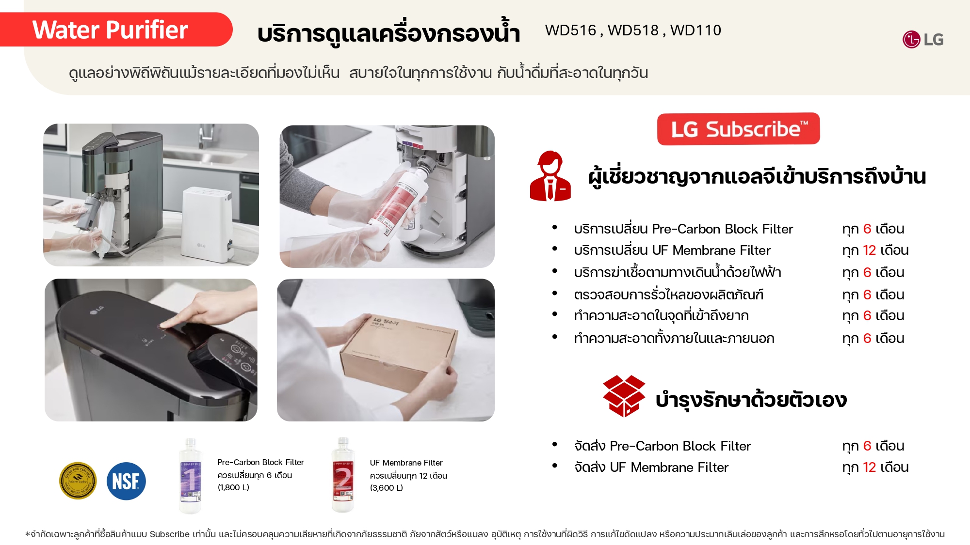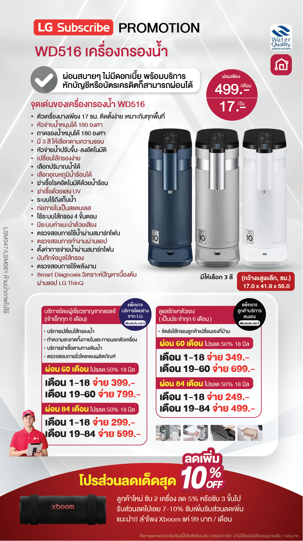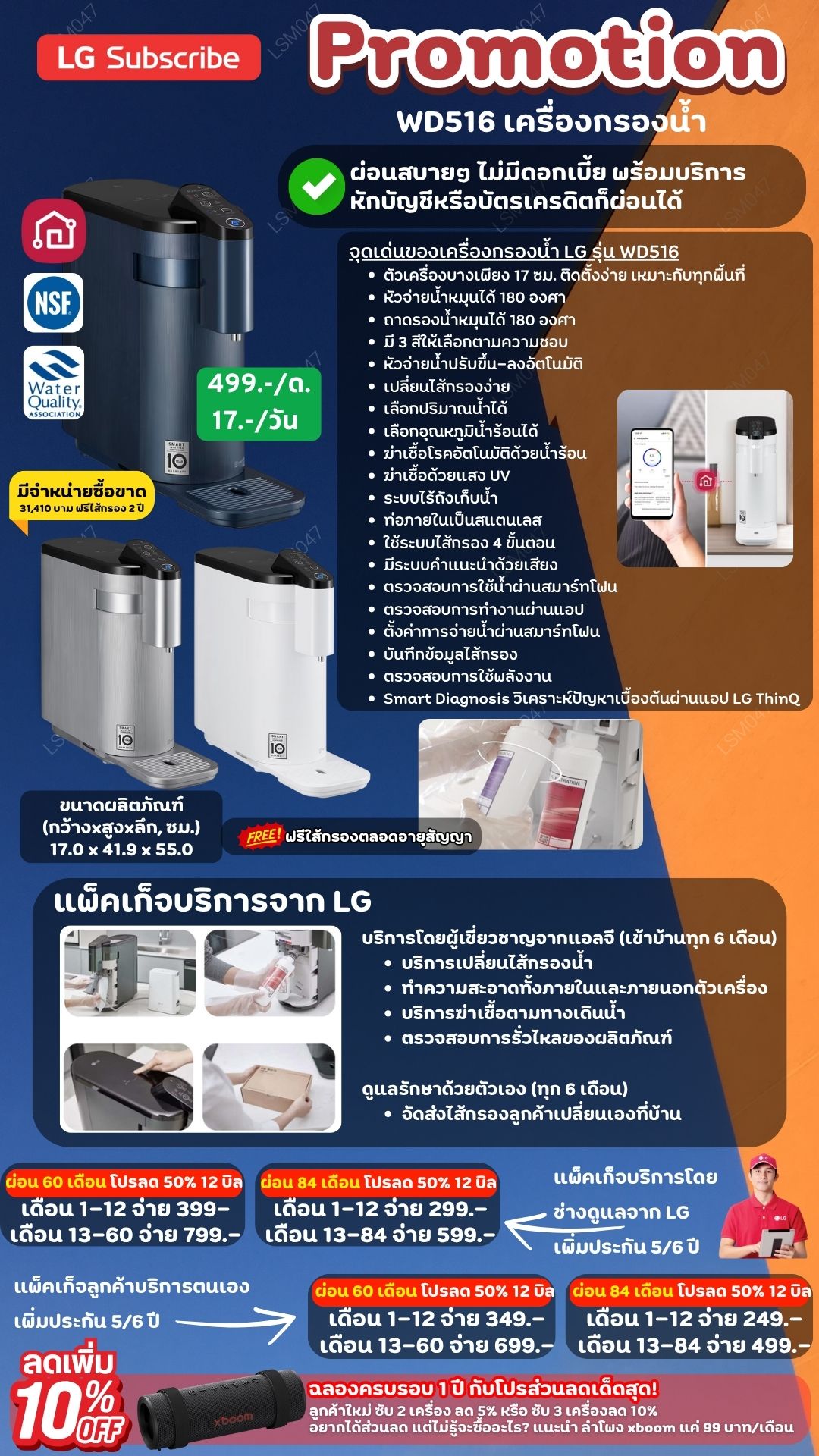 ค่างวดเริ่มต้นเพียง 4xx - 6xx บาทต่อเดือน อัตราดอกเบี้ย 0% นานสูงสุด 60 เดือน รองรับบัตรเครดิตที่วงเงินเหลือน้อยโดยไม่มีการปฏิเสธ ขยายระยะเวลาการรับประกันจาก 1 ปี เป็น 5-7 ปี บริการซ่อมแซมเครื่องโดยไม่มีค่าใช้จ่าย ฟรีค่าแรงและอะไหล่แท้ 100% ไม่มีค่าใช้จ่ายเพิ่มเติมในอนาคต เดือนแรกสามารถใช้งานได้โดยไม่มีค่าใช้จ่าย บริการติดตั้งฟรีโดยช่างจาก LG สิทธิพิเศษเพิ่มเติมอีกเพียบ