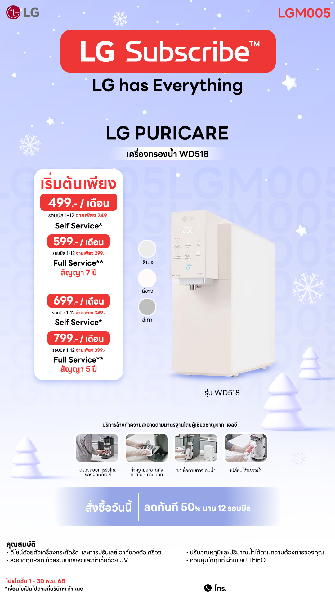 ค่างวดเริ่มต้นเพียง 4xx - 6xx บาทต่อเดือน อัตราดอกเบี้ย 0% นานสูงสุด 60 เดือน รองรับบัตรเครดิตที่วงเงินเหลือน้อยโดยไม่มีการปฏิเสธ ขยายระยะเวลาการรับประกันจาก 1 ปี เป็น 5-7 ปี บริการซ่อมแซมเครื่องโดยไม่มีค่าใช้จ่าย ฟรีค่าแรงและอะไหล่แท้ 100% ไม่มีค่าใช้จ่ายเพิ่มเติมในอนาคต เดือนแรกสามารถใช้งานได้โดยไม่มีค่าใช้จ่าย บริการติดตั้งฟรีโดยช่างจาก LG สิทธิพิเศษเพิ่มเติมอีกเพียบ ดูเพิ่มเติมการผ่อนรายเดือน