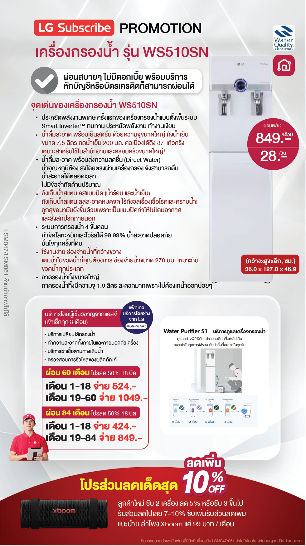 ค่างวดเริ่มต้นเพียง 4xx - 6xx บาทต่อเดือน อัตราดอกเบี้ย 0% นานสูงสุด 60 เดือน รองรับบัตรเครดิตที่วงเงินเหลือน้อยโดยไม่มีการปฏิเสธ ขยายระยะเวลาการรับประกันจาก 1 ปี เป็น 5-7 ปี บริการซ่อมแซมเครื่องโดยไม่มีค่าใช้จ่าย ฟรีค่าแรงและอะไหล่แท้ 100% ไม่มีค่าใช้จ่ายเพิ่มเติมในอนาคต เดือนแรกสามารถใช้งานได้โดยไม่มีค่าใช้จ่าย บริการติดตั้งฟรีโดยช่างจาก LG สิทธิพิเศษเพิ่มเติมอีกเพียบ