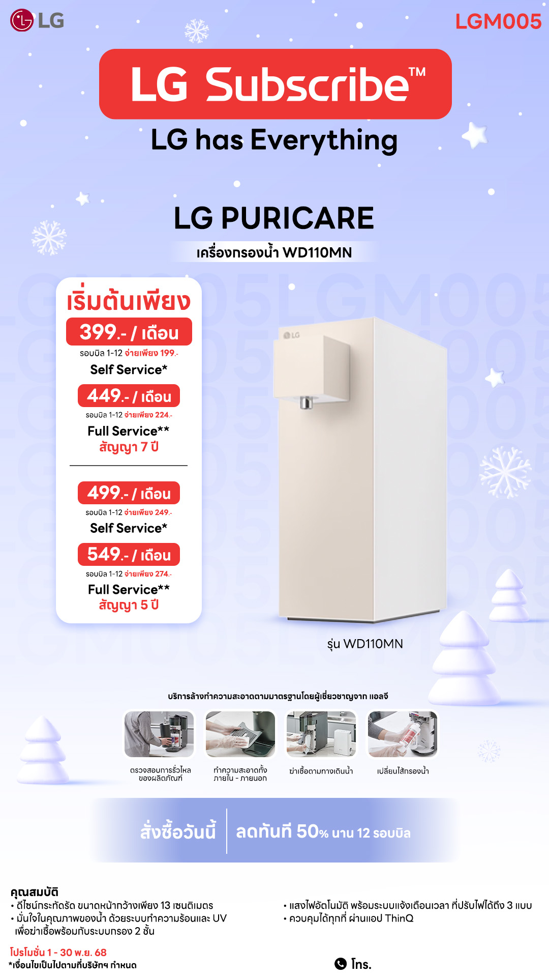 ค่างวดเริ่มต้นเพียง 4xx - 6xx บาทต่อเดือน อัตราดอกเบี้ย 0% นานสูงสุด 60 เดือน รองรับบัตรเครดิตที่วงเงินเหลือน้อยโดยไม่มีการปฏิเสธ ขยายระยะเวลาการรับประกันจาก 1 ปี เป็น 5-7 ปี บริการซ่อมแซมเครื่องโดยไม่มีค่าใช้จ่าย ฟรีค่าแรงและอะไหล่แท้ 100% ไม่มีค่าใช้จ่ายเพิ่มเติมในอนาคต เดือนแรกสามารถใช้งานได้โดยไม่มีค่าใช้จ่าย บริการติดตั้งฟรีโดยช่างจาก LG สิทธิพิเศษเพิ่มเติมอีกเพียบ ดูเพิ่มเติมการผ่อนรายเดือน