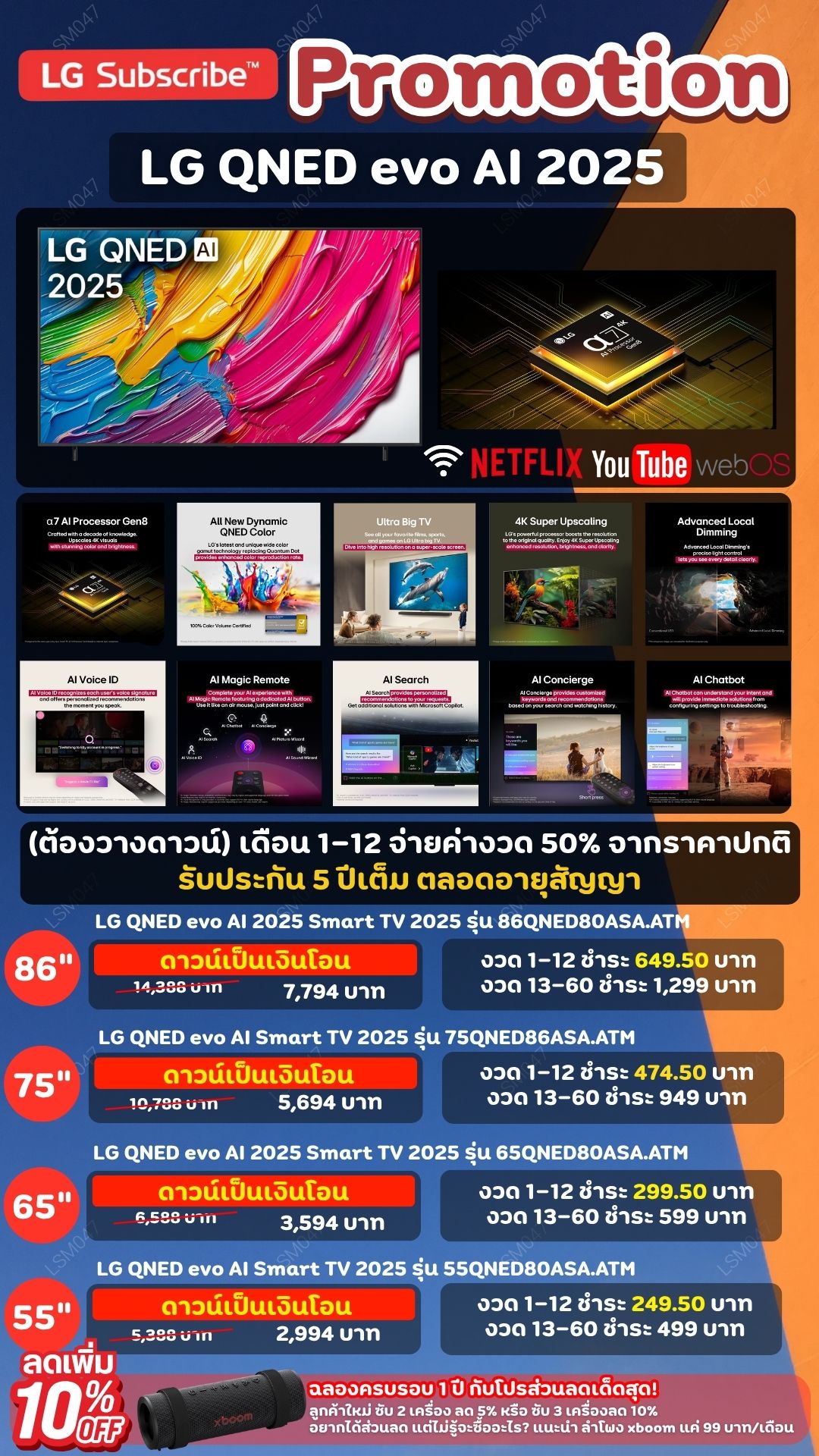 ค่างวดเริ่มต้นเพียง 4xx - 6xx บาทต่อเดือน อัตราดอกเบี้ย 0% นานสูงสุด 60 เดือน รองรับบัตรเครดิตที่วงเงินเหลือน้อยโดยไม่มีการปฏิเสธ ขยายระยะเวลาการรับประกันจาก 1 ปี เป็น 5-7 ปี บริการซ่อมแซมเครื่องโดยไม่มีค่าใช้จ่าย ฟรีค่าแรงและอะไหล่แท้ 100% ไม่มีค่าใช้จ่ายเพิ่มเติมในอนาคต เดือนแรกสามารถใช้งานได้โดยไม่มีค่าใช้จ่าย บริการติดตั้งฟรีโดยช่างจาก LG สิทธิพิเศษเพิ่มเติมอีกเพียบ