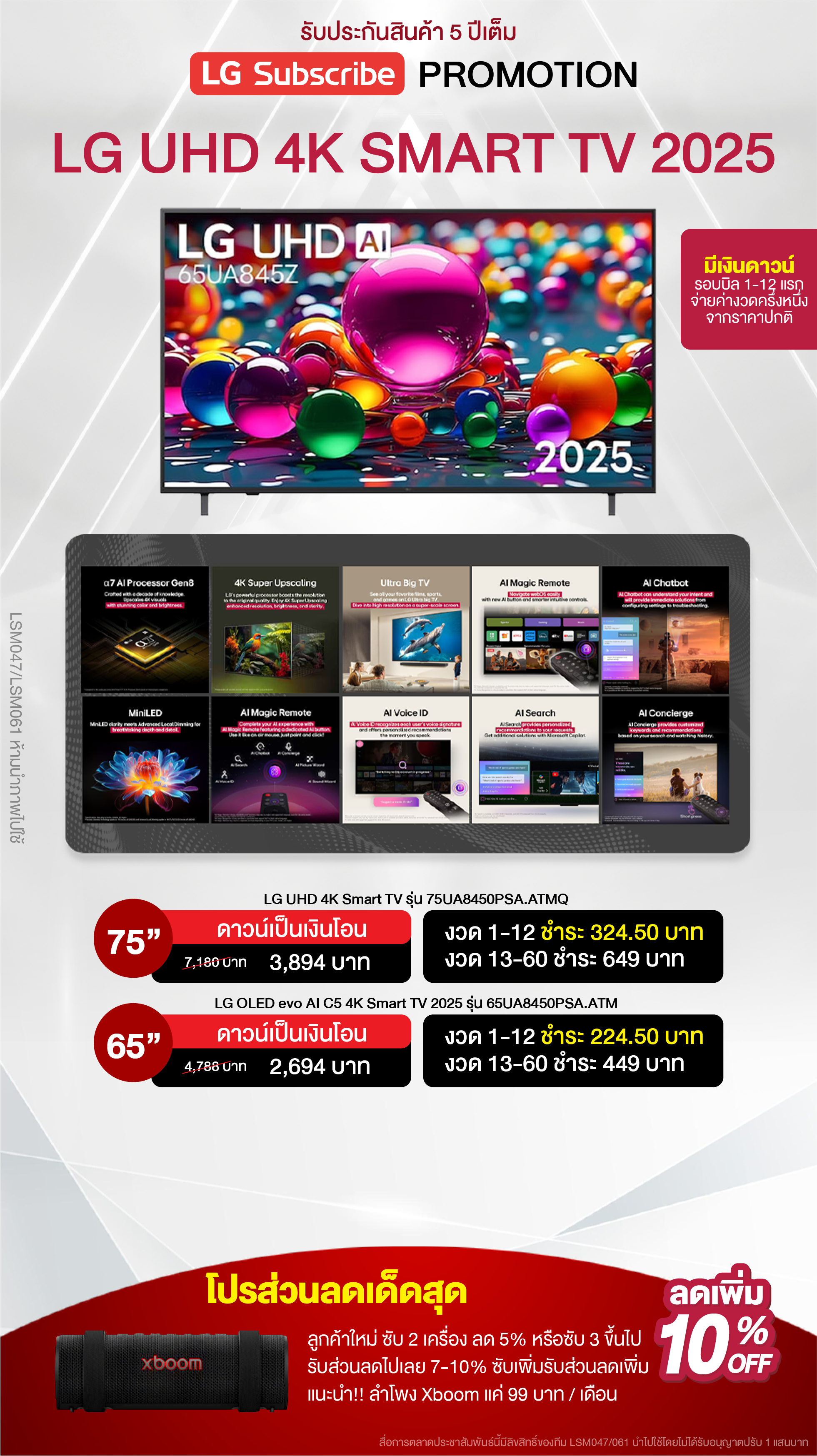 ค่างวดเริ่มต้นเพียง 4xx - 6xx บาทต่อเดือน อัตราดอกเบี้ย 0% นานสูงสุด 60 เดือน รองรับบัตรเครดิตที่วงเงินเหลือน้อยโดยไม่มีการปฏิเสธ ขยายระยะเวลาการรับประกันจาก 1 ปี เป็น 5-7 ปี บริการซ่อมแซมเครื่องโดยไม่มีค่าใช้จ่าย ฟรีค่าแรงและอะไหล่แท้ 100% ไม่มีค่าใช้จ่ายเพิ่มเติมในอนาคต เดือนแรกสามารถใช้งานได้โดยไม่มีค่าใช้จ่าย บริการติดตั้งฟรีโดยช่างจาก LG สิทธิพิเศษเพิ่มเติมอีกเพียบ