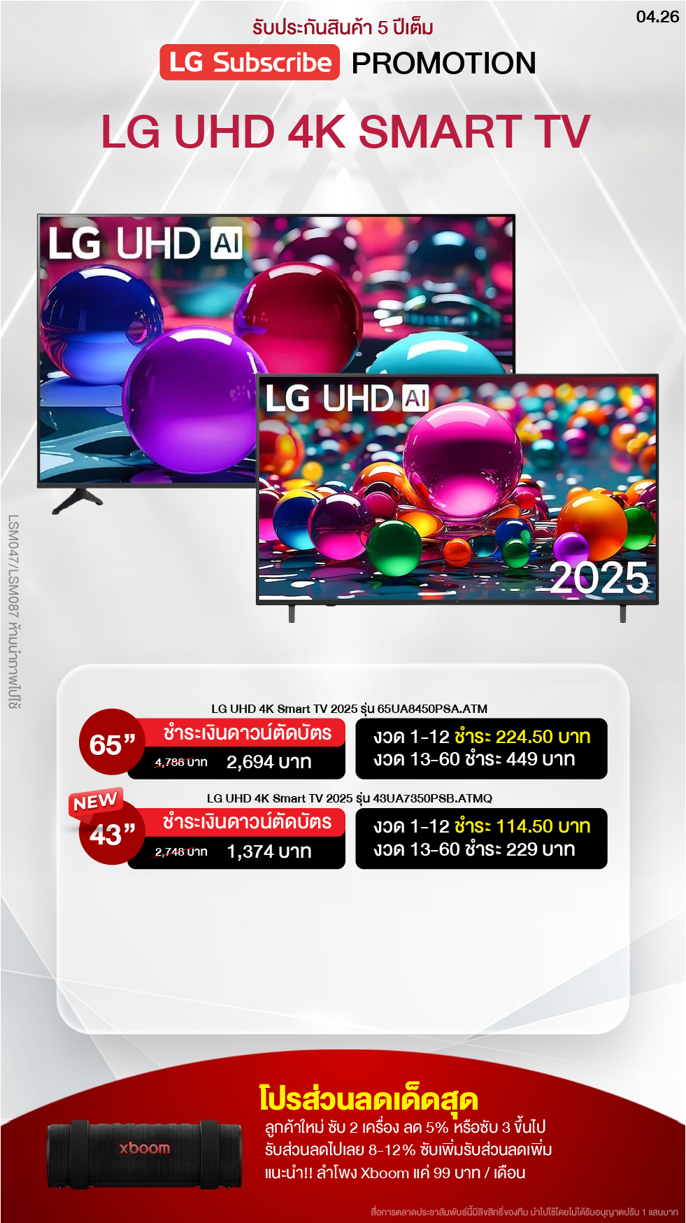 สินค้า 4 ประเภทที่ลูกค้าต้องชำระเงินดาวน์ก่อนรับสินค้า ทีวี มอนิเตอร์ ซาวด์บาร์ และลำโพง xboom แต่ข้อดีคือ 12 เดือนแรกผ่อนสบาย ครึ่งหนึ่งของค่างวดปกติ