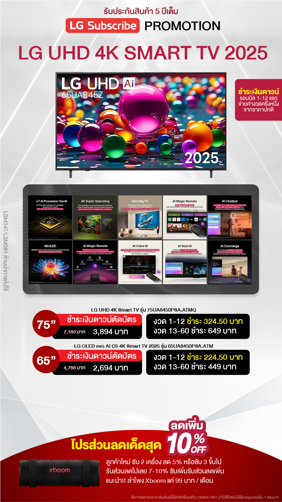 ค่างวดเริ่มต้นเพียง 4xx - 6xx บาทต่อเดือน อัตราดอกเบี้ย 0% นานสูงสุด 60 เดือน รองรับบัตรเครดิตที่วงเงินเหลือน้อยโดยไม่มีการปฏิเสธ ขยายระยะเวลาการรับประกันจาก 1 ปี เป็น 5-7 ปี บริการซ่อมแซมเครื่องโดยไม่มีค่าใช้จ่าย ฟรีค่าแรงและอะไหล่แท้ 100% ไม่มีค่าใช้จ่ายเพิ่มเติมในอนาคต เดือนแรกสามารถใช้งานได้โดยไม่มีค่าใช้จ่าย บริการติดตั้งฟรีโดยช่างจาก LG สิทธิพิเศษเพิ่มเติมอีกเพียบ