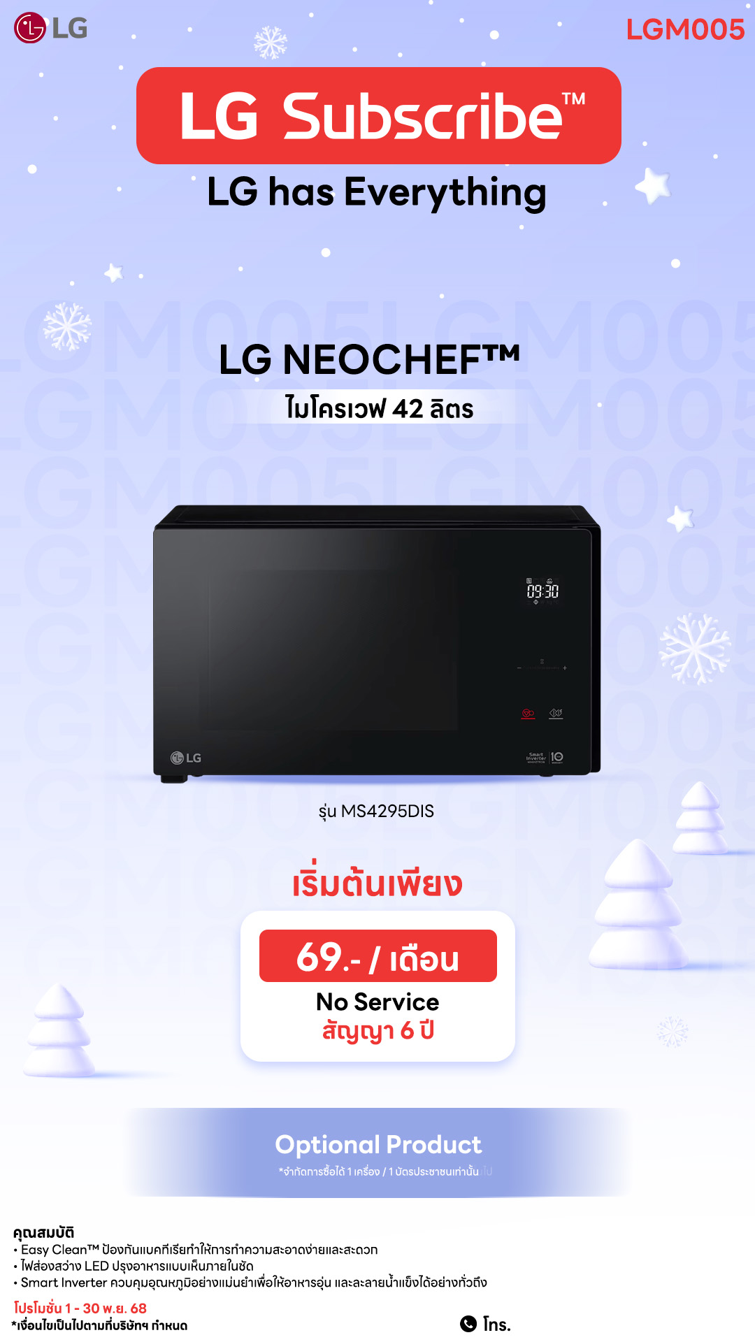 ค่างวดเริ่มต้นเพียง 4xx - 6xx บาทต่อเดือน อัตราดอกเบี้ย 0% นานสูงสุด 60 เดือน รองรับบัตรเครดิตที่วงเงินเต็มโดยไม่มีการปฏิเสธ ขยายระยะเวลาการรับประกันจาก 1 ปี เป็น 5-7 ปี บริการซ่อมแซมเครื่องโดยไม่มีค่าใช้จ่าย ฟรีค่าแรงและอะไหล่แท้ 100% ไม่มีค่าใช้จ่ายเพิ่มเติมในอนาคต เดือนแรกสามารถใช้งานได้โดยไม่มีค่าใช้จ่าย บริการติดตั้งฟรีโดยช่างจาก LG สิทธิพิเศษเพิ่มเติมอีกเพียบ ดูเพิ่มเติมการผ่อนรายเดือน