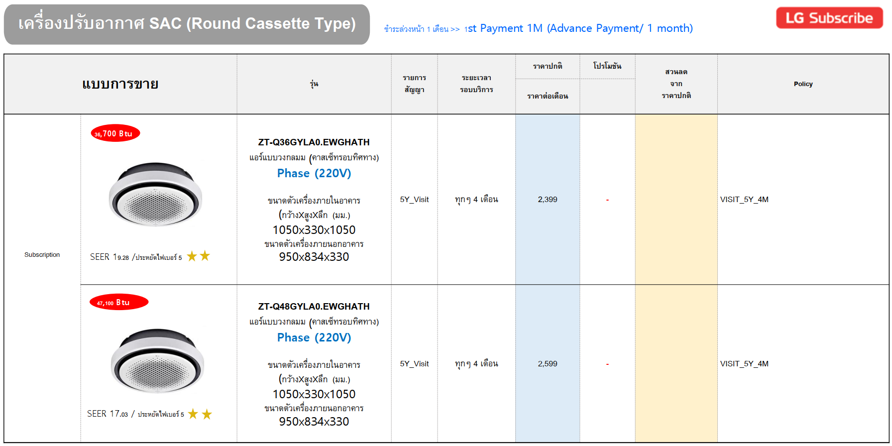 เครื่องปรับอากาศ SAC (Round Cassette Type) 36700 - 47100 BTU แอร์แบบวงกลม