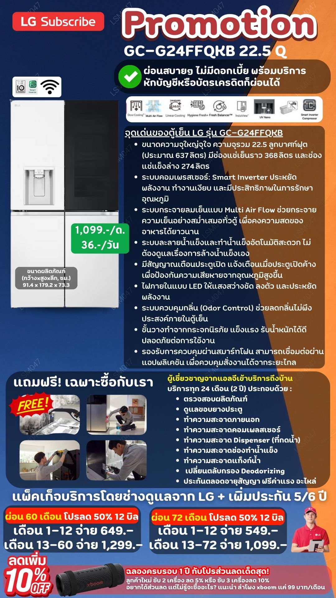 ค่างวดเริ่มต้นเพียง 4xx - 6xx บาทต่อเดือน อัตราดอกเบี้ย 0% นานสูงสุด 60 เดือน รองรับบัตรเครดิตที่วงเงินเหลือน้อยโดยไม่มีการปฏิเสธ ขยายระยะเวลาการรับประกันจาก 1 ปี เป็น 5-7 ปี บริการซ่อมแซมเครื่องโดยไม่มีค่าใช้จ่าย ฟรีค่าแรงและอะไหล่แท้ 100% ไม่มีค่าใช้จ่ายเพิ่มเติมในอนาคต เดือนแรกสามารถใช้งานได้โดยไม่มีค่าใช้จ่าย บริการติดตั้งฟรีโดยช่างจาก LG สิทธิพิเศษเพิ่มเติมอีกเพียบ