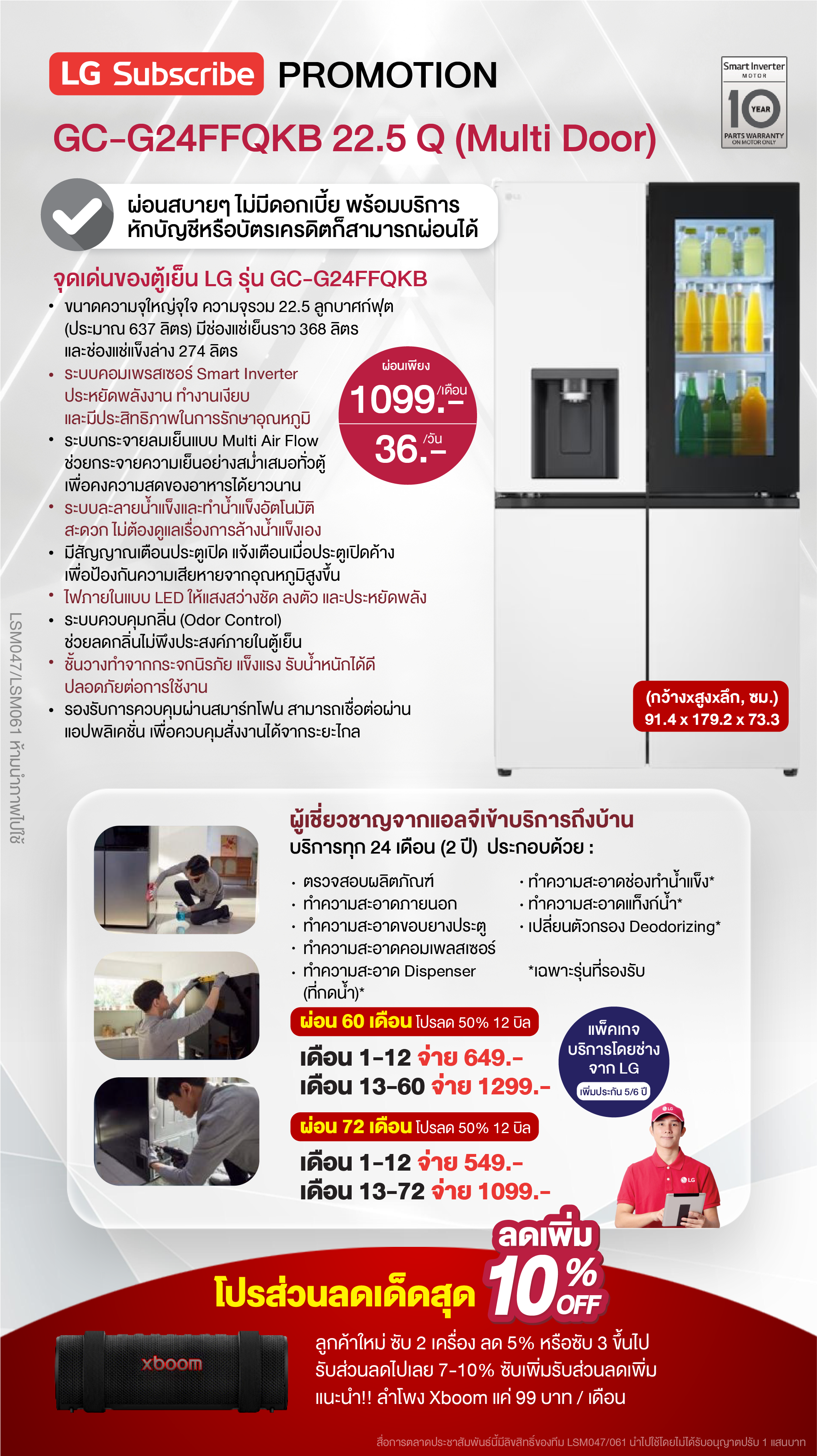 ค่างวดเริ่มต้นเพียง 4xx - 6xx บาทต่อเดือน อัตราดอกเบี้ย 0% นานสูงสุด 60 เดือน รองรับบัตรเครดิตที่วงเงินเหลือน้อยโดยไม่มีการปฏิเสธ ขยายระยะเวลาการรับประกันจาก 1 ปี เป็น 5-7 ปี บริการซ่อมแซมเครื่องโดยไม่มีค่าใช้จ่าย ฟรีค่าแรงและอะไหล่แท้ 100% ไม่มีค่าใช้จ่ายเพิ่มเติมในอนาคต เดือนแรกสามารถใช้งานได้โดยไม่มีค่าใช้จ่าย บริการติดตั้งฟรีโดยช่างจาก LG สิทธิพิเศษเพิ่มเติมอีกเพียบ