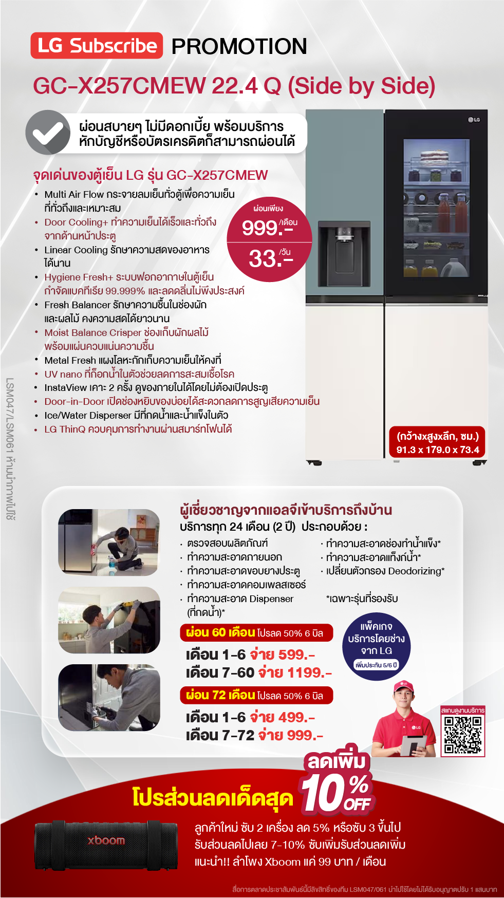 ค่างวดเริ่มต้นเพียง 4xx - 6xx บาทต่อเดือน อัตราดอกเบี้ย 0% นานสูงสุด 60 เดือน รองรับบัตรเครดิตที่วงเงินเหลือน้อยโดยไม่มีการปฏิเสธ ขยายระยะเวลาการรับประกันจาก 1 ปี เป็น 5-7 ปี บริการซ่อมแซมเครื่องโดยไม่มีค่าใช้จ่าย ฟรีค่าแรงและอะไหล่แท้ 100% ไม่มีค่าใช้จ่ายเพิ่มเติมในอนาคต เดือนแรกสามารถใช้งานได้โดยไม่มีค่าใช้จ่าย บริการติดตั้งฟรีโดยช่างจาก LG สิทธิพิเศษเพิ่มเติมอีกเพียบ