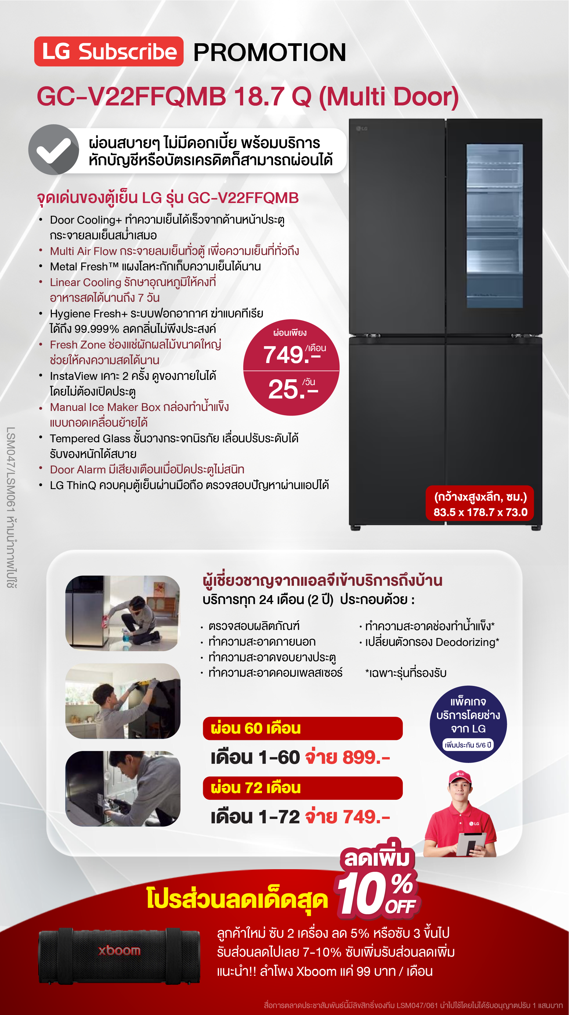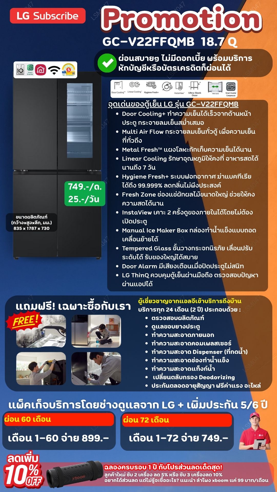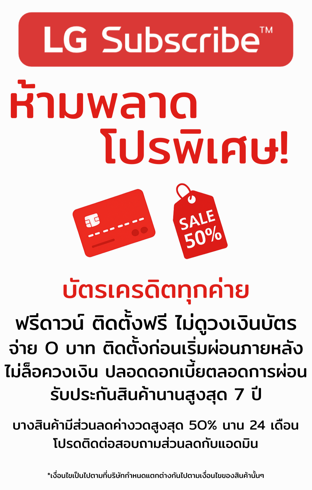 ค่างวดเริ่มต้นเพียง 4xx - 6xx บาทต่อเดือน อัตราดอกเบี้ย 0% นานสูงสุด 60 เดือน รองรับบัตรเครดิตที่วงเงินเหลือน้อยโดยไม่มีการปฏิเสธ ขยายระยะเวลาการรับประกันจาก 1 ปี เป็น 5-7 ปี บริการซ่อมแซมเครื่องโดยไม่มีค่าใช้จ่าย ฟรีค่าแรงและอะไหล่แท้ 100% ไม่มีค่าใช้จ่ายเพิ่มเติมในอนาคต เดือนแรกสามารถใช้งานได้โดยไม่มีค่าใช้จ่าย บริการติดตั้งฟรีโดยช่างจาก LG สิทธิพิเศษเพิ่มเติมอีกเพียบ