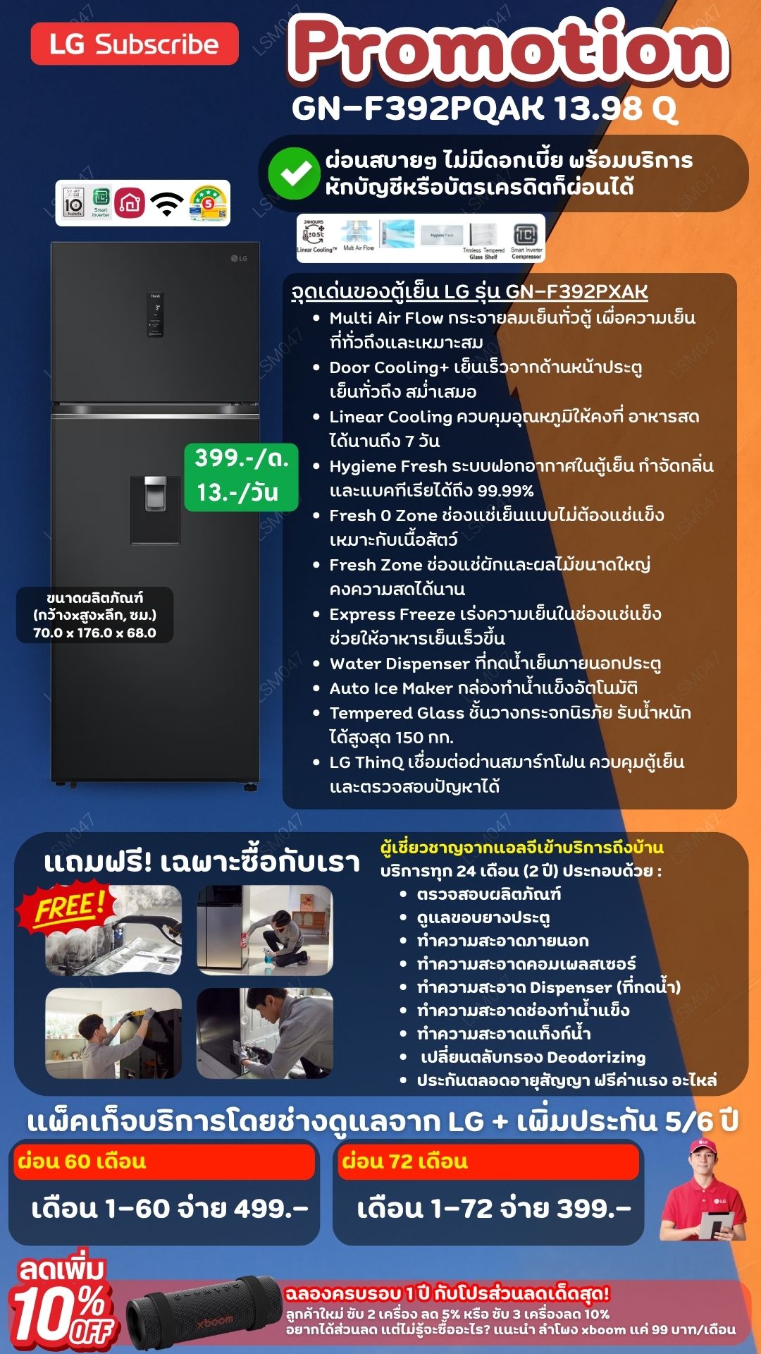ค่างวดเริ่มต้นเพียง 4xx - 6xx บาทต่อเดือน อัตราดอกเบี้ย 0% นานสูงสุด 60 เดือน รองรับบัตรเครดิตที่วงเงินเหลือน้อยโดยไม่มีการปฏิเสธ ขยายระยะเวลาการรับประกันจาก 1 ปี เป็น 5-7 ปี บริการซ่อมแซมเครื่องโดยไม่มีค่าใช้จ่าย ฟรีค่าแรงและอะไหล่แท้ 100% ไม่มีค่าใช้จ่ายเพิ่มเติมในอนาคต เดือนแรกสามารถใช้งานได้โดยไม่มีค่าใช้จ่าย บริการติดตั้งฟรีโดยช่างจาก LG สิทธิพิเศษเพิ่มเติมอีกเพียบ
