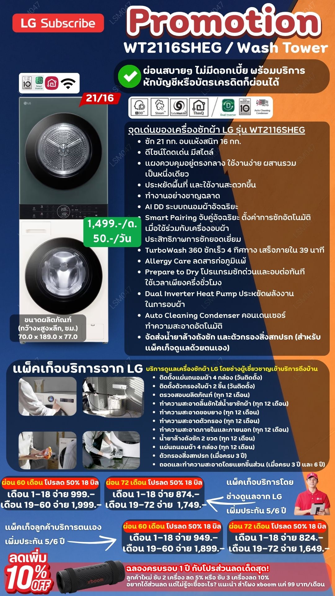 ค่างวดเริ่มต้นเพียง 4xx - 6xx บาทต่อเดือน อัตราดอกเบี้ย 0% นานสูงสุด 60 เดือน รองรับบัตรเครดิตที่วงเงินเหลือน้อยโดยไม่มีการปฏิเสธ ขยายระยะเวลาการรับประกันจาก 1 ปี เป็น 5-7 ปี บริการซ่อมแซมเครื่องโดยไม่มีค่าใช้จ่าย ฟรีค่าแรงและอะไหล่แท้ 100% ไม่มีค่าใช้จ่ายเพิ่มเติมในอนาคต เดือนแรกสามารถใช้งานได้โดยไม่มีค่าใช้จ่าย บริการติดตั้งฟรีโดยช่างจาก LG สิทธิพิเศษเพิ่มเติมอีกเพียบ