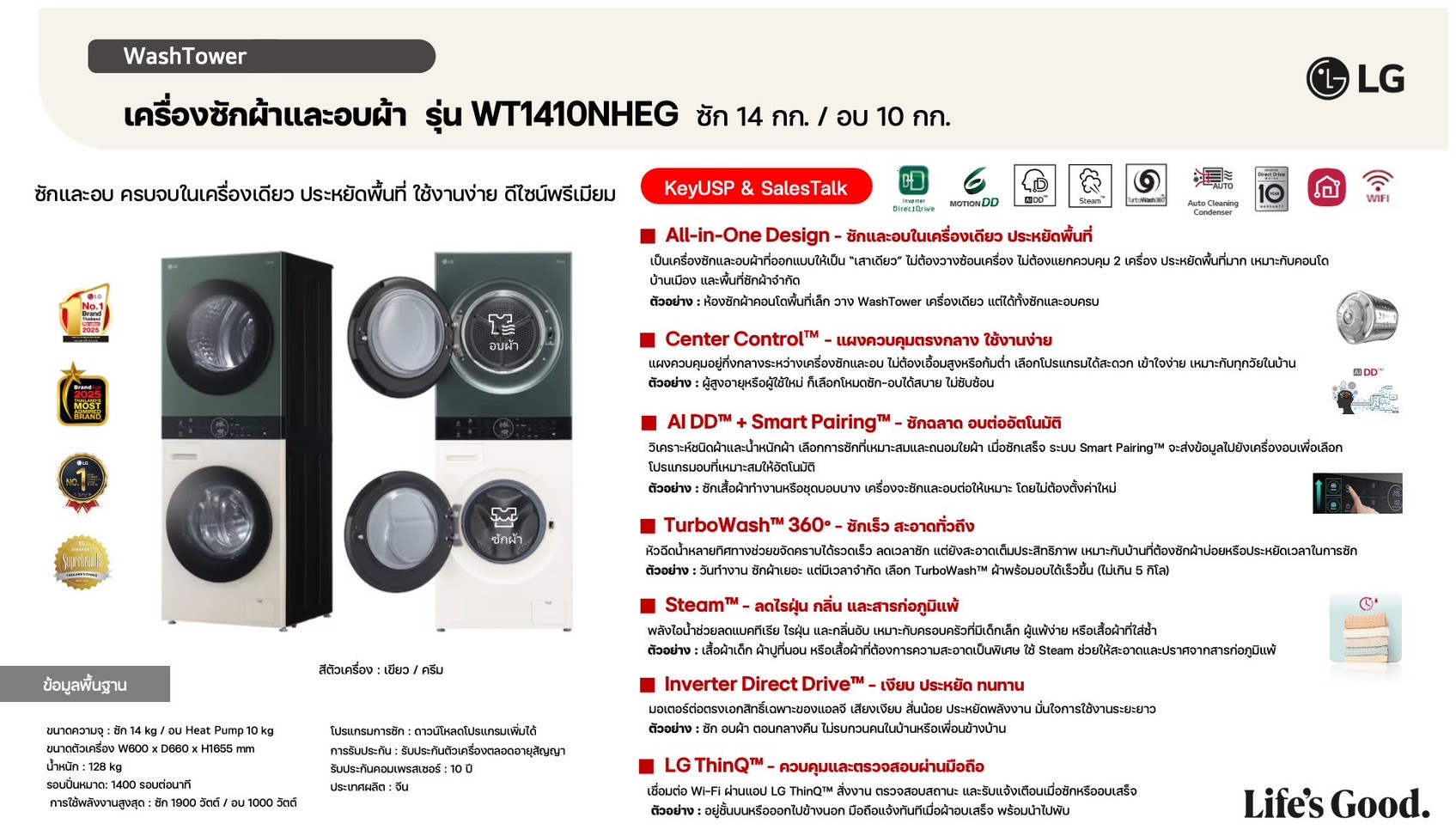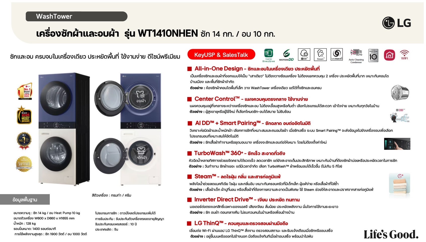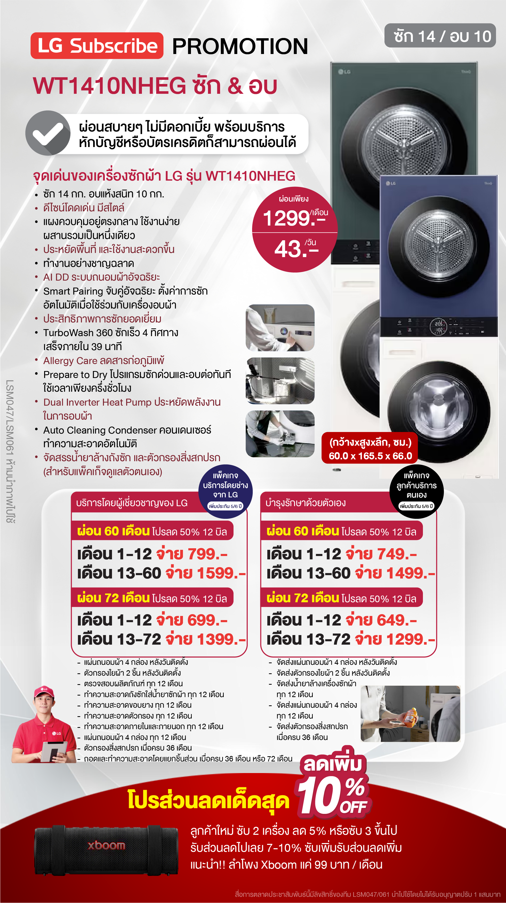 ค่างวดเริ่มต้นเพียง 4xx - 6xx บาทต่อเดือน อัตราดอกเบี้ย 0% นานสูงสุด 60 เดือน รองรับบัตรเครดิตที่วงเงินเหลือน้อยโดยไม่มีการปฏิเสธ ขยายระยะเวลาการรับประกันจาก 1 ปี เป็น 5-7 ปี บริการซ่อมแซมเครื่องโดยไม่มีค่าใช้จ่าย ฟรีค่าแรงและอะไหล่แท้ 100% ไม่มีค่าใช้จ่ายเพิ่มเติมในอนาคต เดือนแรกสามารถใช้งานได้โดยไม่มีค่าใช้จ่าย บริการติดตั้งฟรีโดยช่างจาก LG สิทธิพิเศษเพิ่มเติมอีกเพียบ