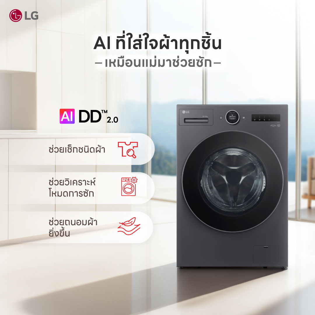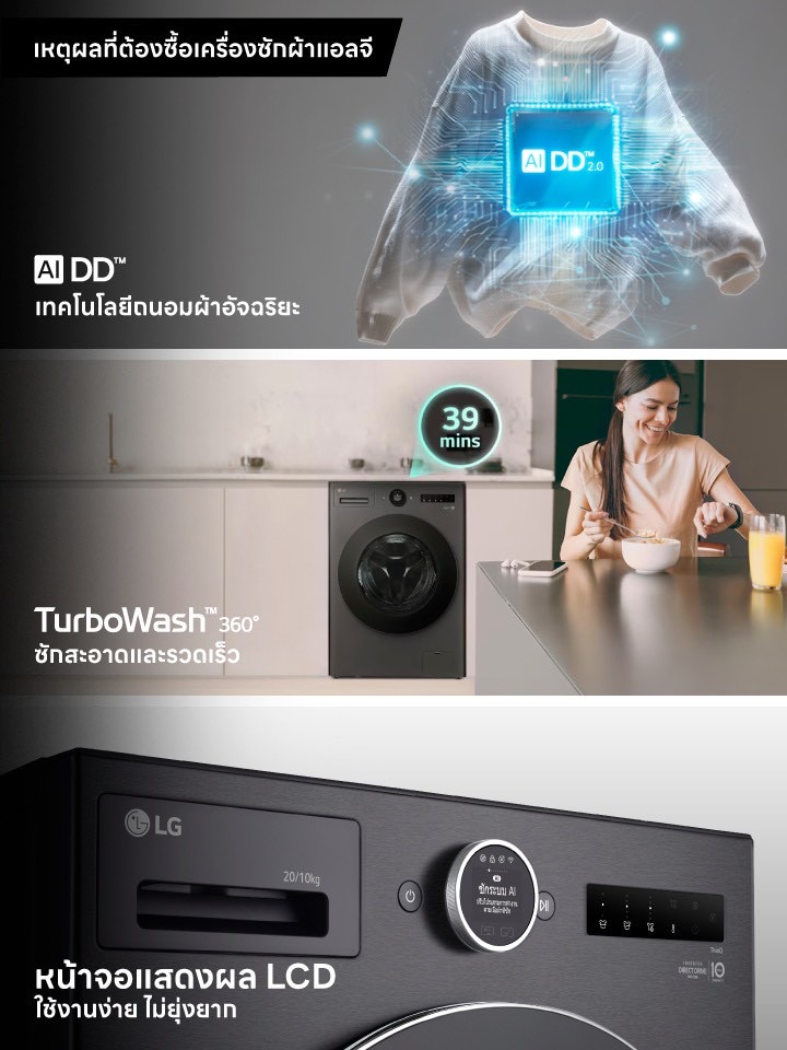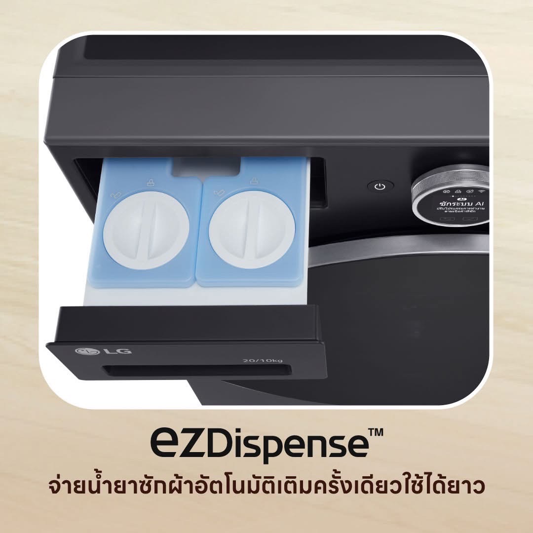 ซักอบจบในเครื่องเดียวด้วย AI Wash 2.0 ถนอมผ้าแม่นยำ ซักเร็ว 39 นาที พร้อมจอ LCD ใช้งานง่าย ezDispense™