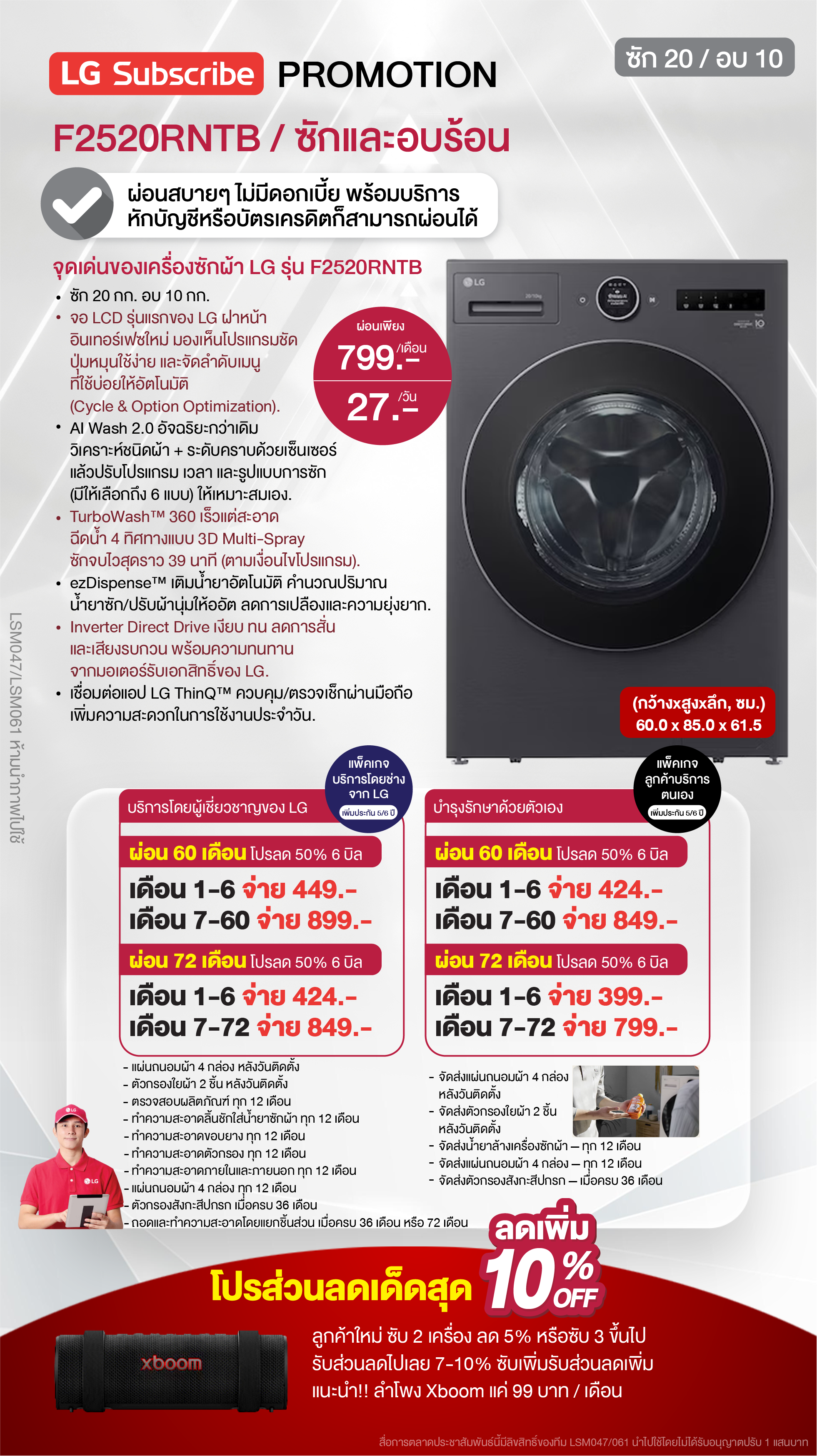 ค่างวดเริ่มต้นเพียง 4xx - 6xx บาทต่อเดือน อัตราดอกเบี้ย 0% นานสูงสุด 60 เดือน รองรับบัตรเครดิตที่วงเงินเหลือน้อยโดยไม่มีการปฏิเสธ ขยายระยะเวลาการรับประกันจาก 1 ปี เป็น 5-7 ปี บริการซ่อมแซมเครื่องโดยไม่มีค่าใช้จ่าย ฟรีค่าแรงและอะไหล่แท้ 100% ไม่มีค่าใช้จ่ายเพิ่มเติมในอนาคต เดือนแรกสามารถใช้งานได้โดยไม่มีค่าใช้จ่าย บริการติดตั้งฟรีโดยช่างจาก LG สิทธิพิเศษเพิ่มเติมอีกเพียบ