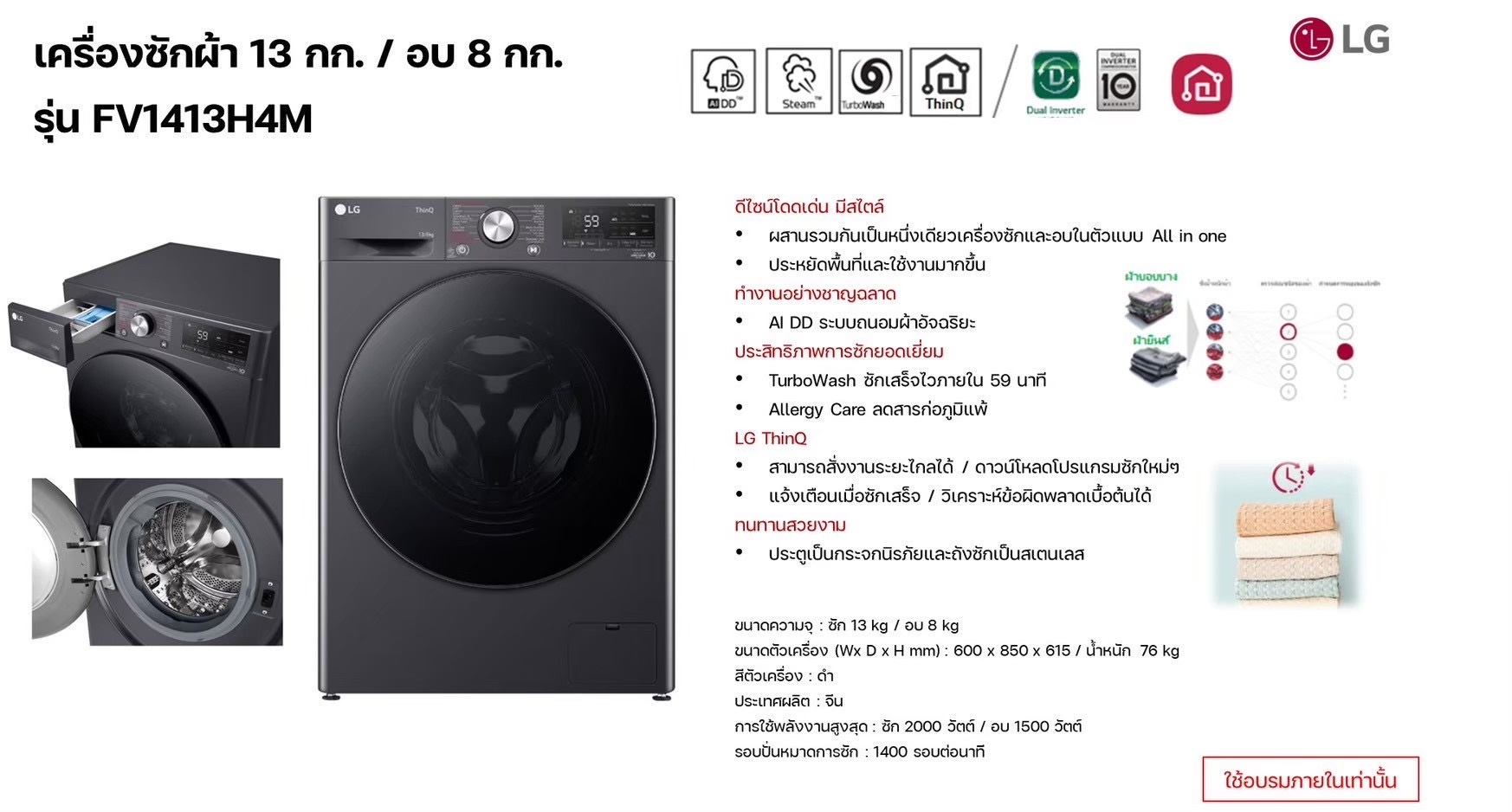 ซักสะอาดรวดเร็วด้วย TurboWash™ ถนอมผ้าด้วย AI DD™ พร้อมระบบไอน้ำลดสารก่อภูมิแพ้ ควบคุมผ่านแอป ThinQ ได้สะดวก