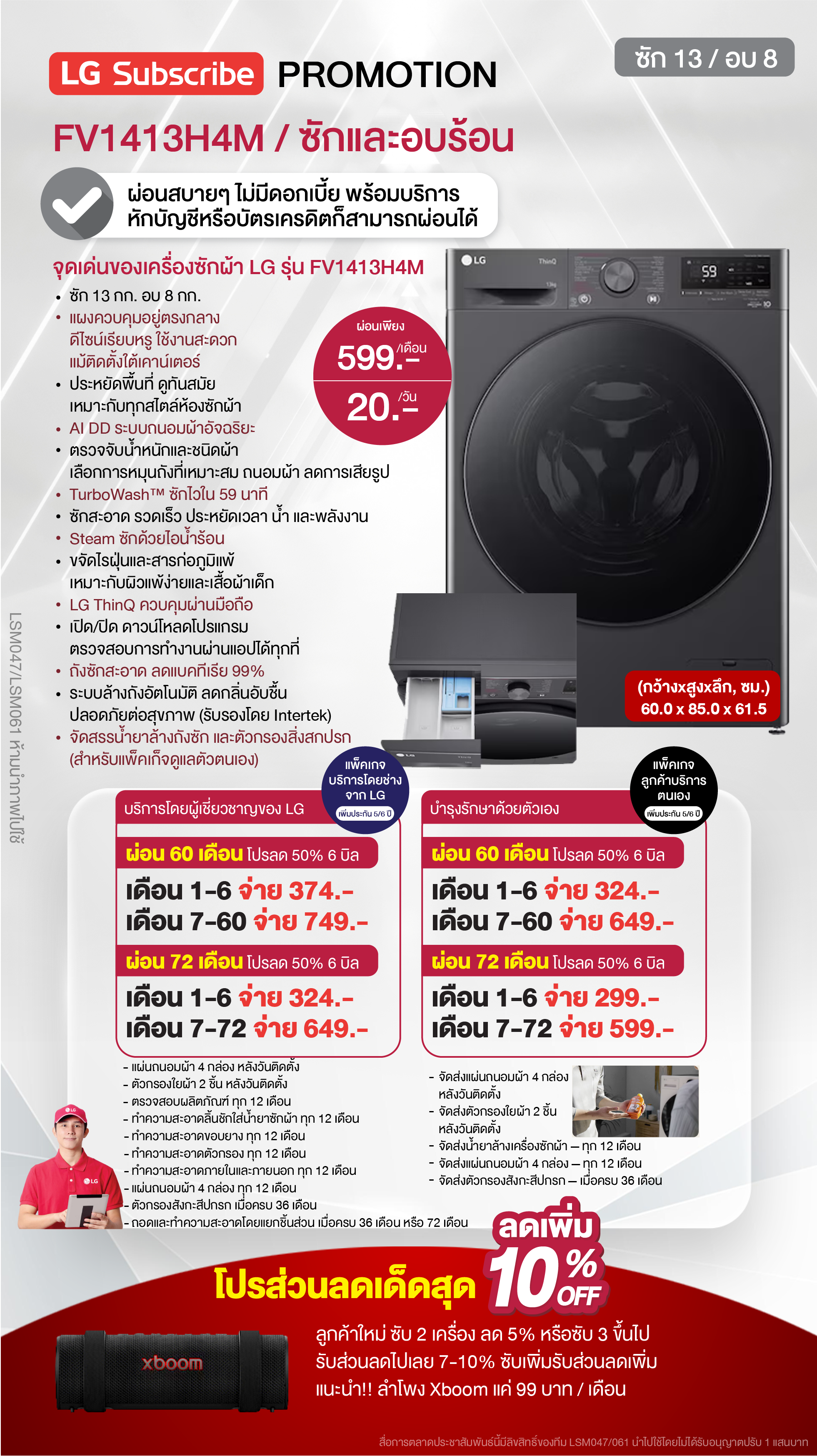 ค่างวดเริ่มต้นเพียง 4xx - 6xx บาทต่อเดือน อัตราดอกเบี้ย 0% นานสูงสุด 60 เดือน รองรับบัตรเครดิตที่วงเงินเหลือน้อยโดยไม่มีการปฏิเสธ ขยายระยะเวลาการรับประกันจาก 1 ปี เป็น 5-7 ปี บริการซ่อมแซมเครื่องโดยไม่มีค่าใช้จ่าย ฟรีค่าแรงและอะไหล่แท้ 100% ไม่มีค่าใช้จ่ายเพิ่มเติมในอนาคต เดือนแรกสามารถใช้งานได้โดยไม่มีค่าใช้จ่าย บริการติดตั้งฟรีโดยช่างจาก LG สิทธิพิเศษเพิ่มเติมอีกเพียบ