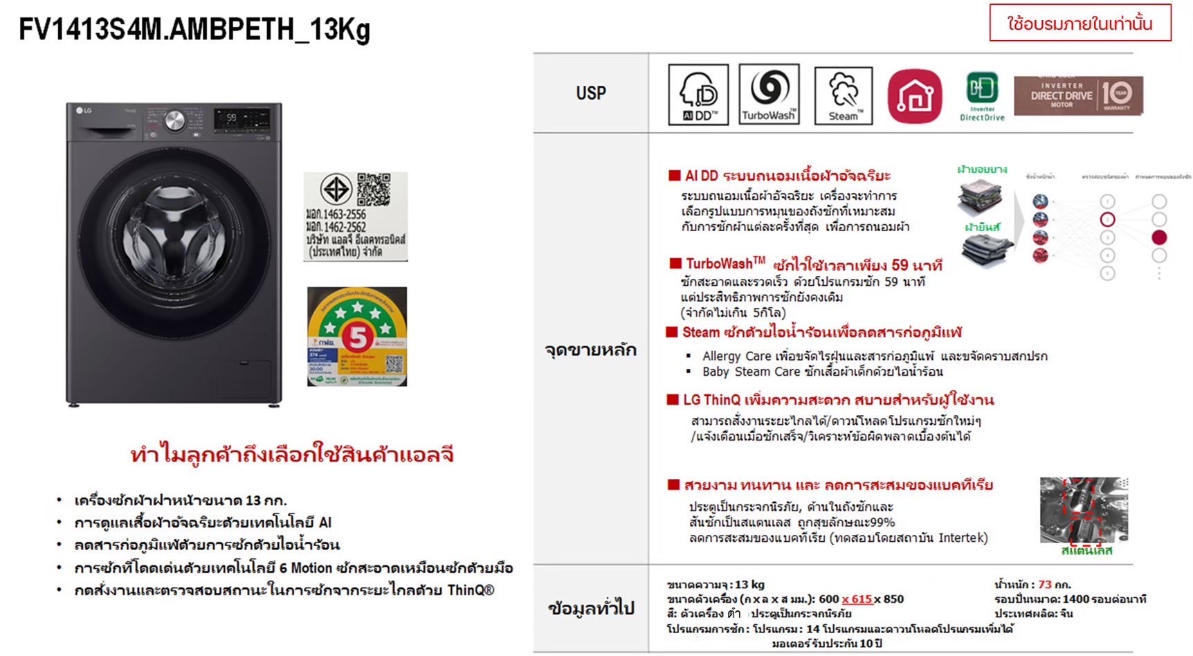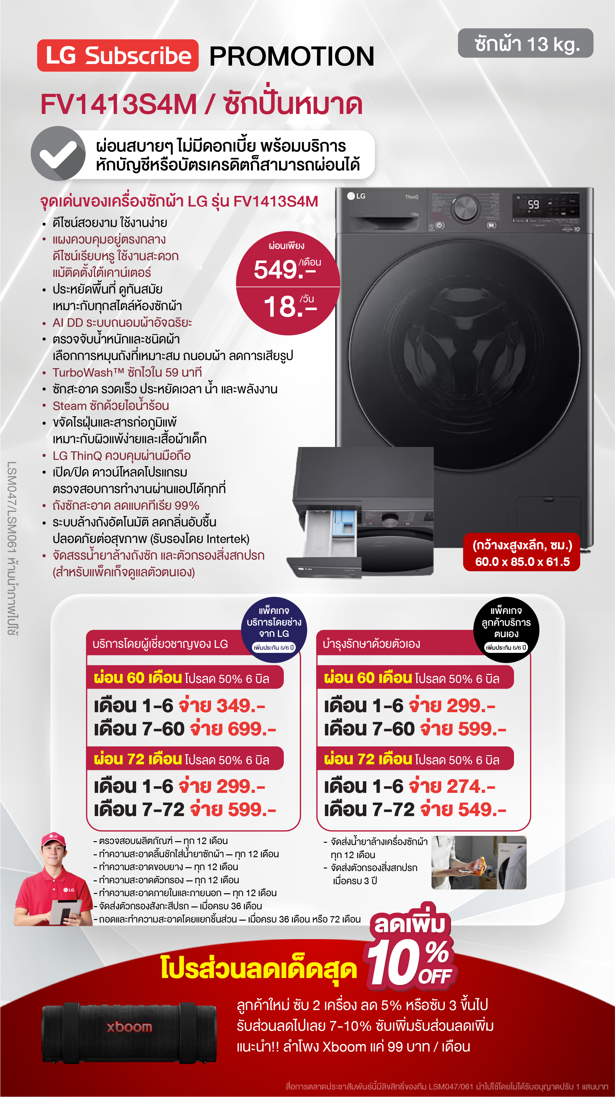 ค่างวดเริ่มต้นเพียง 4xx - 6xx บาทต่อเดือน อัตราดอกเบี้ย 0% นานสูงสุด 60 เดือน รองรับบัตรเครดิตที่วงเงินเหลือน้อยโดยไม่มีการปฏิเสธ ขยายระยะเวลาการรับประกันจาก 1 ปี เป็น 5-7 ปี บริการซ่อมแซมเครื่องโดยไม่มีค่าใช้จ่าย ฟรีค่าแรงและอะไหล่แท้ 100% ไม่มีค่าใช้จ่ายเพิ่มเติมในอนาคต เดือนแรกสามารถใช้งานได้โดยไม่มีค่าใช้จ่าย บริการติดตั้งฟรีโดยช่างจาก LG สิทธิพิเศษเพิ่มเติมอีกเพียบ