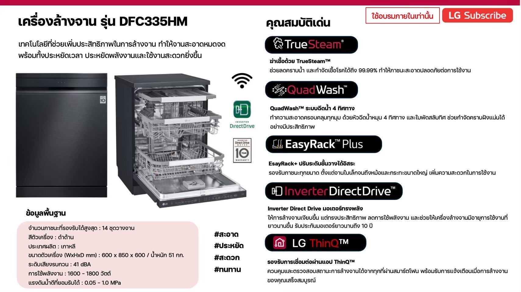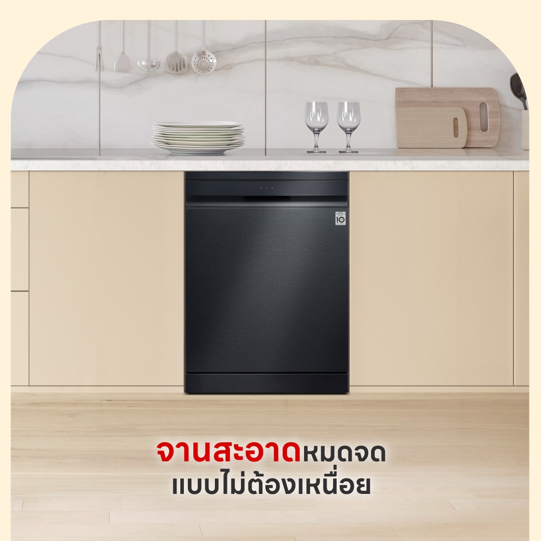 มาพร้อมเทคโนโลยี TrueSteam™ และ QuadWash™ ล้างจานสะอาดล้ำลึก ฆ่าเชื้อแบคทีเรียได้ถึง 99.99% พร้อมควบคุมผ่านแอป LG ThinQ™.