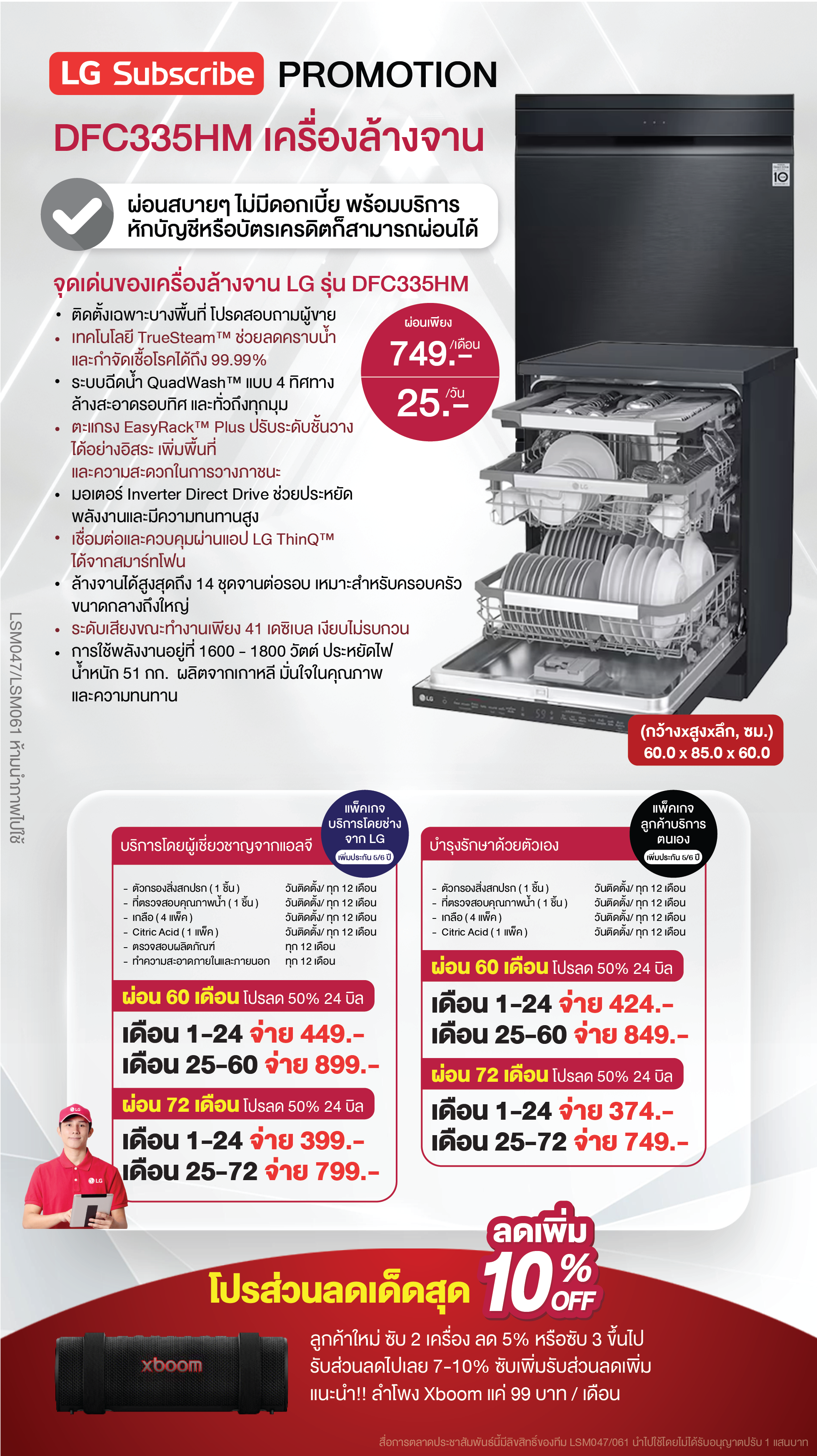 ค่างวดเริ่มต้นเพียง 4xx - 6xx บาทต่อเดือน อัตราดอกเบี้ย 0% นานสูงสุด 60 เดือน รองรับบัตรเครดิตที่วงเงินเหลือน้อยโดยไม่มีการปฏิเสธ ขยายระยะเวลาการรับประกันจาก 1 ปี เป็น 5-7 ปี บริการซ่อมแซมเครื่องโดยไม่มีค่าใช้จ่าย ฟรีค่าแรงและอะไหล่แท้ 100% ไม่มีค่าใช้จ่ายเพิ่มเติมในอนาคต เดือนแรกสามารถใช้งานได้โดยไม่มีค่าใช้จ่าย บริการติดตั้งฟรีโดยช่างจาก LG สิทธิพิเศษเพิ่มเติมอีกเพียบ