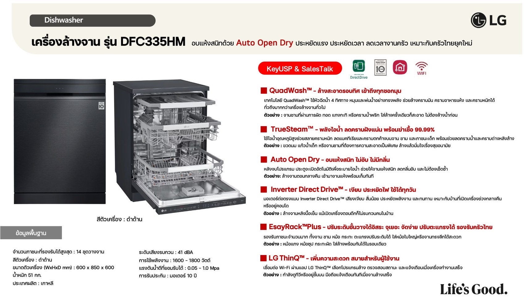 เครื่องล้างจาน DFC335HM สีดำ พร้อมฟีเจอร์ Wi‑Fi Control (ThinQ)