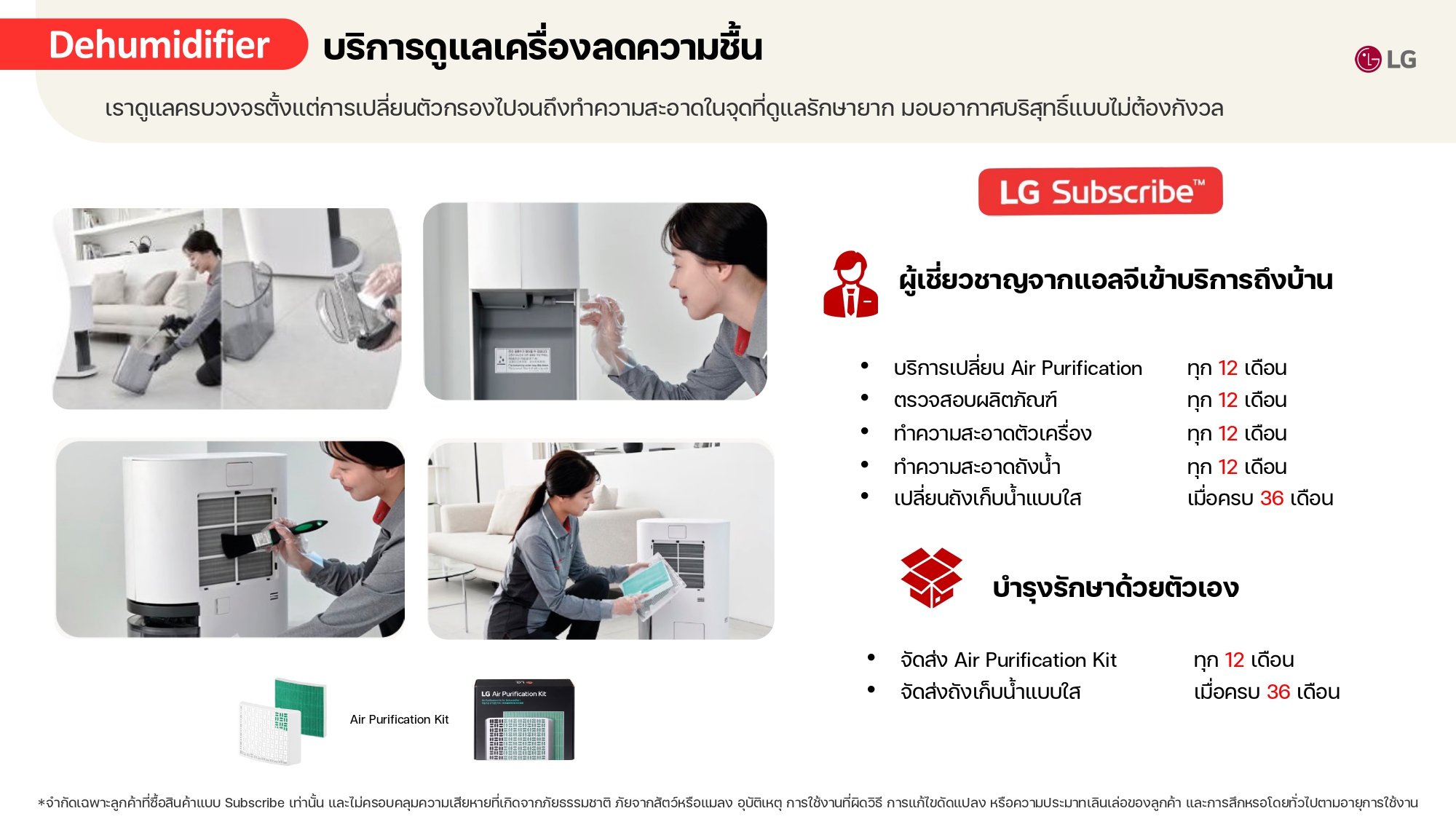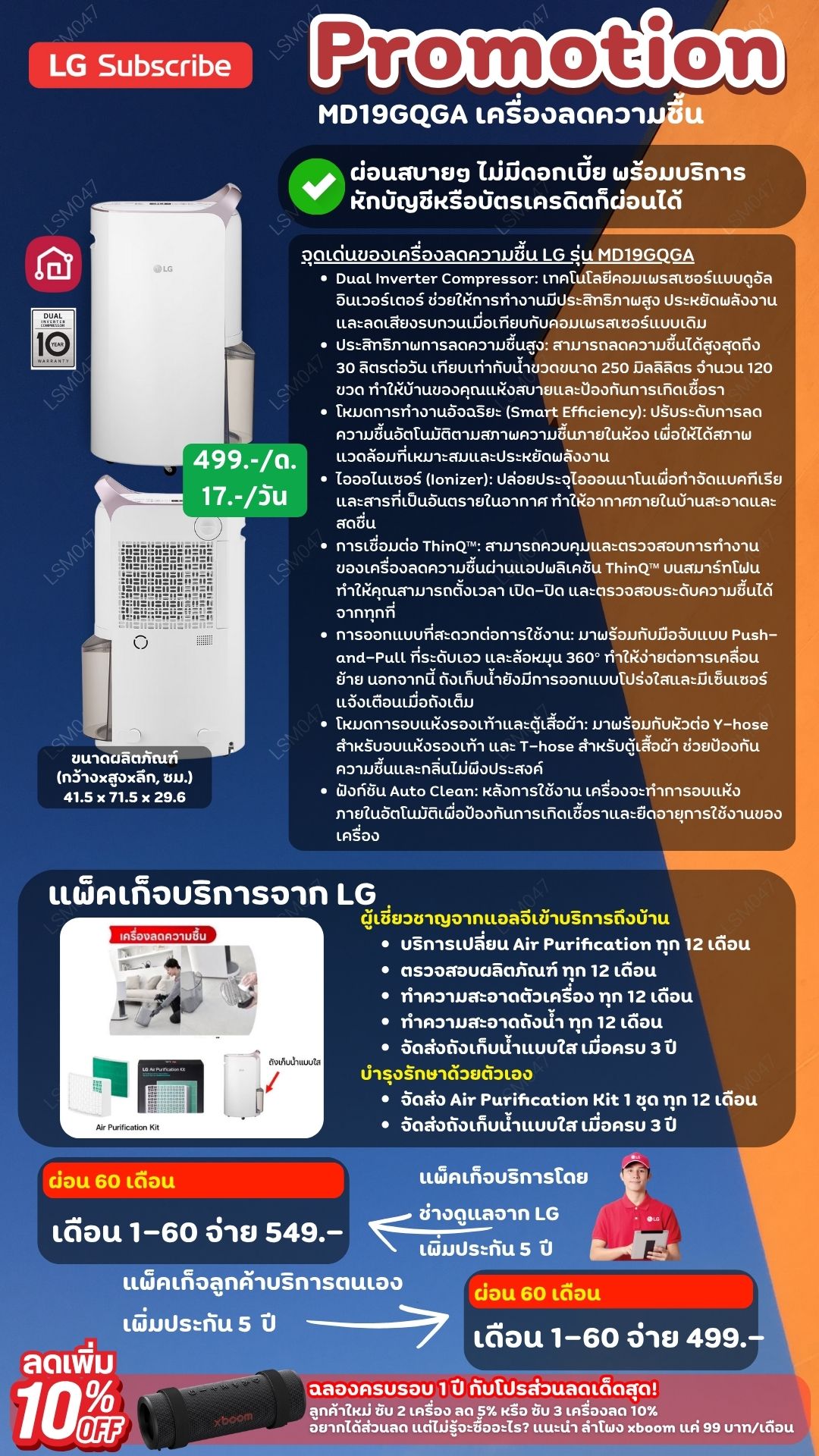 ค่างวดเริ่มต้นเพียง 4xx - 6xx บาทต่อเดือน อัตราดอกเบี้ย 0% นานสูงสุด 60 เดือน รองรับบัตรเครดิตที่วงเงินเหลือน้อยโดยไม่มีการปฏิเสธ ขยายระยะเวลาการรับประกันจาก 1 ปี เป็น 5-7 ปี บริการซ่อมแซมเครื่องโดยไม่มีค่าใช้จ่าย ฟรีค่าแรงและอะไหล่แท้ 100% ไม่มีค่าใช้จ่ายเพิ่มเติมในอนาคต เดือนแรกสามารถใช้งานได้โดยไม่มีค่าใช้จ่าย บริการติดตั้งฟรีโดยช่างจาก LG สิทธิพิเศษเพิ่มเติมอีกเพียบ