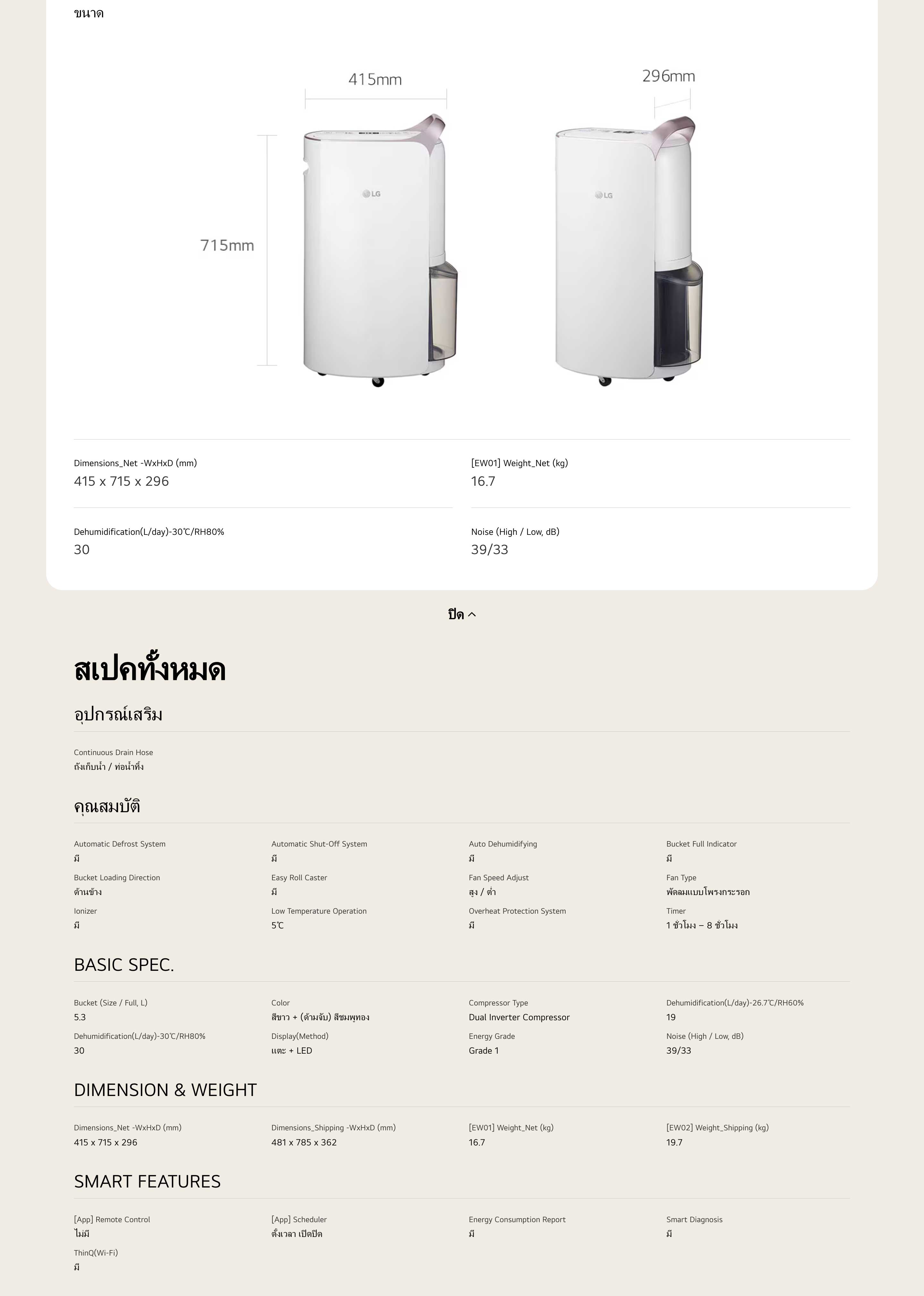 ขนาด 19 ลิตร มาพร้อม Dual Inverter ประหยัดพลังงาน เสียงเงียบเพียง 33 dB และควบคุมผ่านแอป LG ThinQ™ ได้