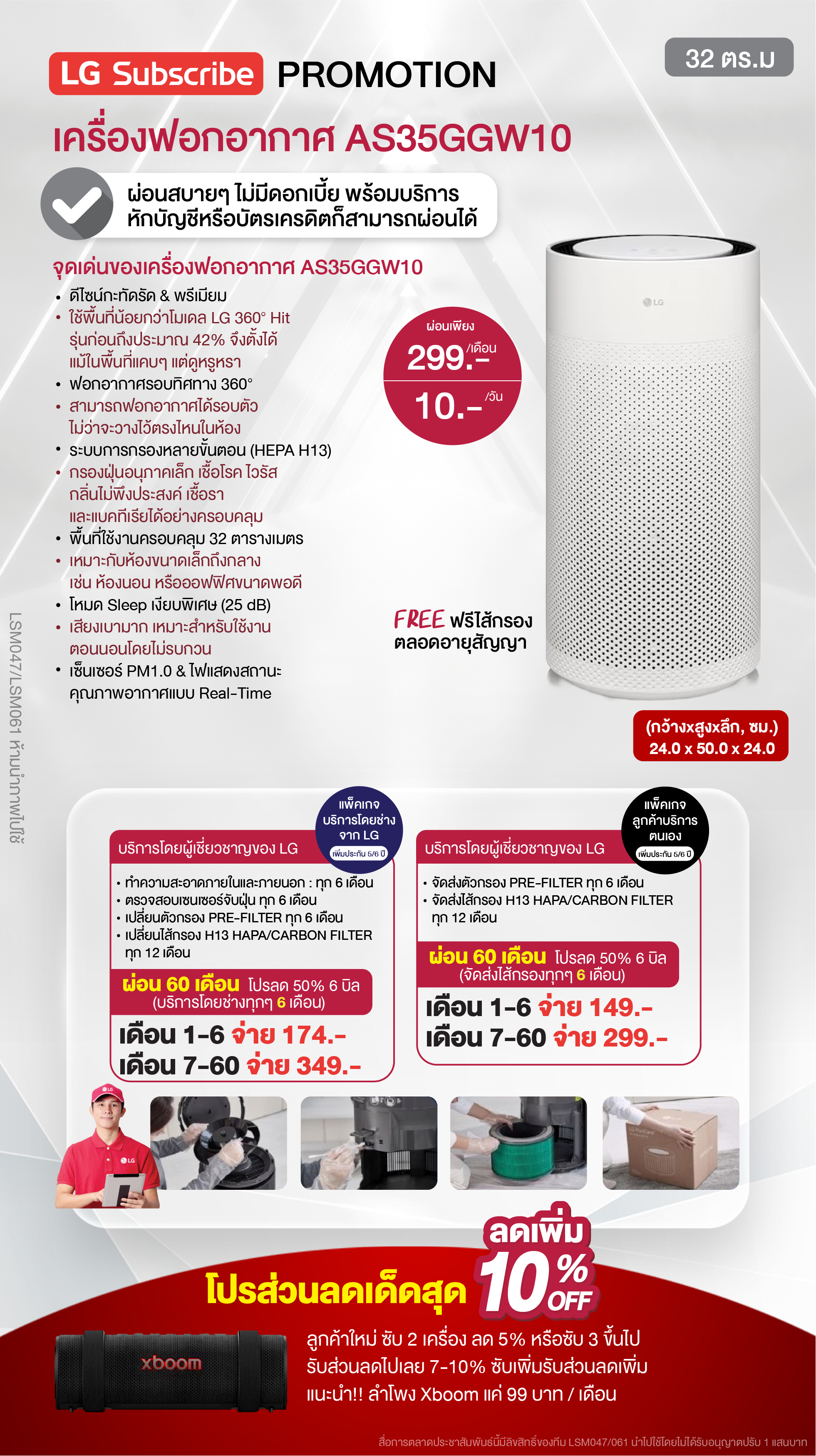 ค่างวดเริ่มต้นเพียง 4xx - 6xx บาทต่อเดือน อัตราดอกเบี้ย 0% นานสูงสุด 60 เดือน รองรับบัตรเครดิตที่วงเงินเหลือน้อยโดยไม่มีการปฏิเสธ ขยายระยะเวลาการรับประกันจาก 1 ปี เป็น 5-7 ปี บริการซ่อมแซมเครื่องโดยไม่มีค่าใช้จ่าย ฟรีค่าแรงและอะไหล่แท้ 100% ไม่มีค่าใช้จ่ายเพิ่มเติมในอนาคต เดือนแรกสามารถใช้งานได้โดยไม่มีค่าใช้จ่าย บริการติดตั้งฟรีโดยช่างจาก LG สิทธิพิเศษเพิ่มเติมอีกเพียบ