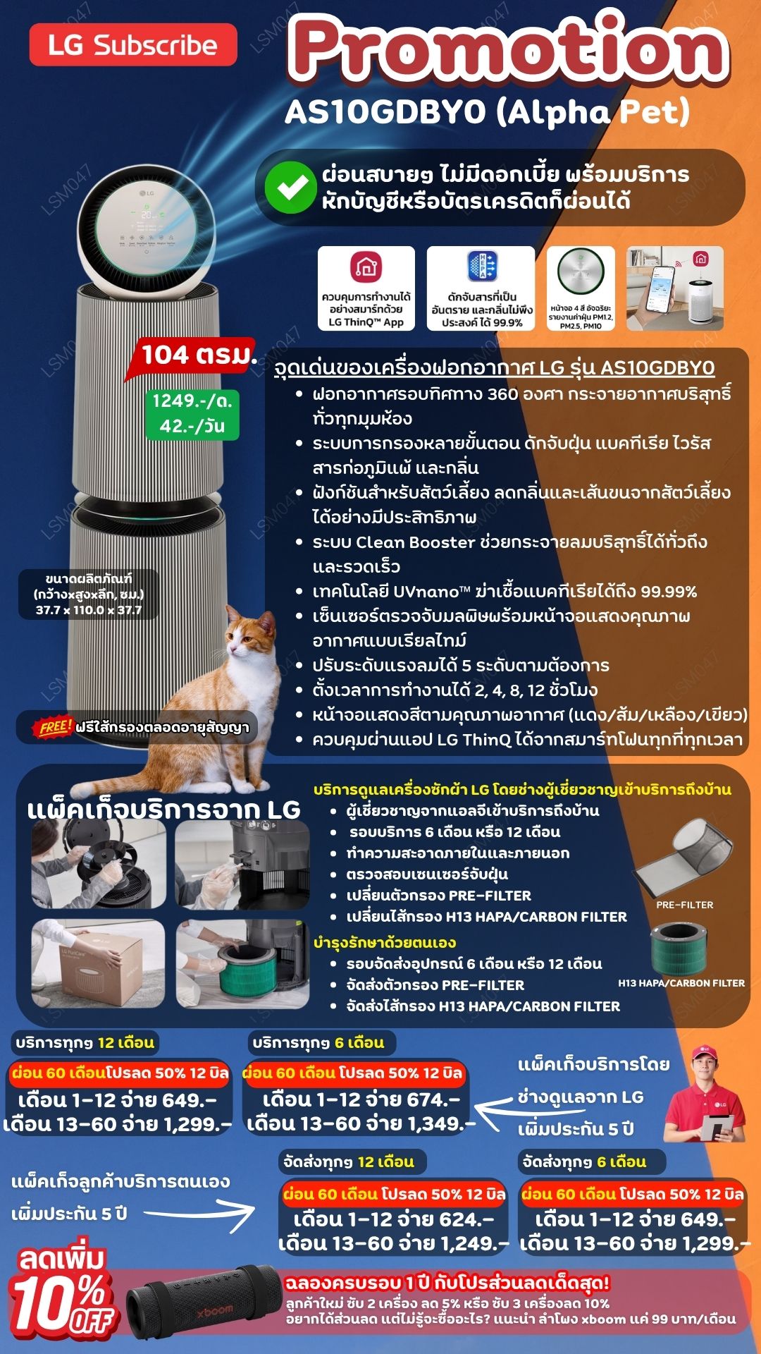 ค่างวดเริ่มต้นเพียง 4xx - 6xx บาทต่อเดือน อัตราดอกเบี้ย 0% นานสูงสุด 60 เดือน รองรับบัตรเครดิตที่วงเงินเหลือน้อยโดยไม่มีการปฏิเสธ ขยายระยะเวลาการรับประกันจาก 1 ปี เป็น 5-7 ปี บริการซ่อมแซมเครื่องโดยไม่มีค่าใช้จ่าย ฟรีค่าแรงและอะไหล่แท้ 100% ไม่มีค่าใช้จ่ายเพิ่มเติมในอนาคต เดือนแรกสามารถใช้งานได้โดยไม่มีค่าใช้จ่าย บริการติดตั้งฟรีโดยช่างจาก LG สิทธิพิเศษเพิ่มเติมอีกเพียบ