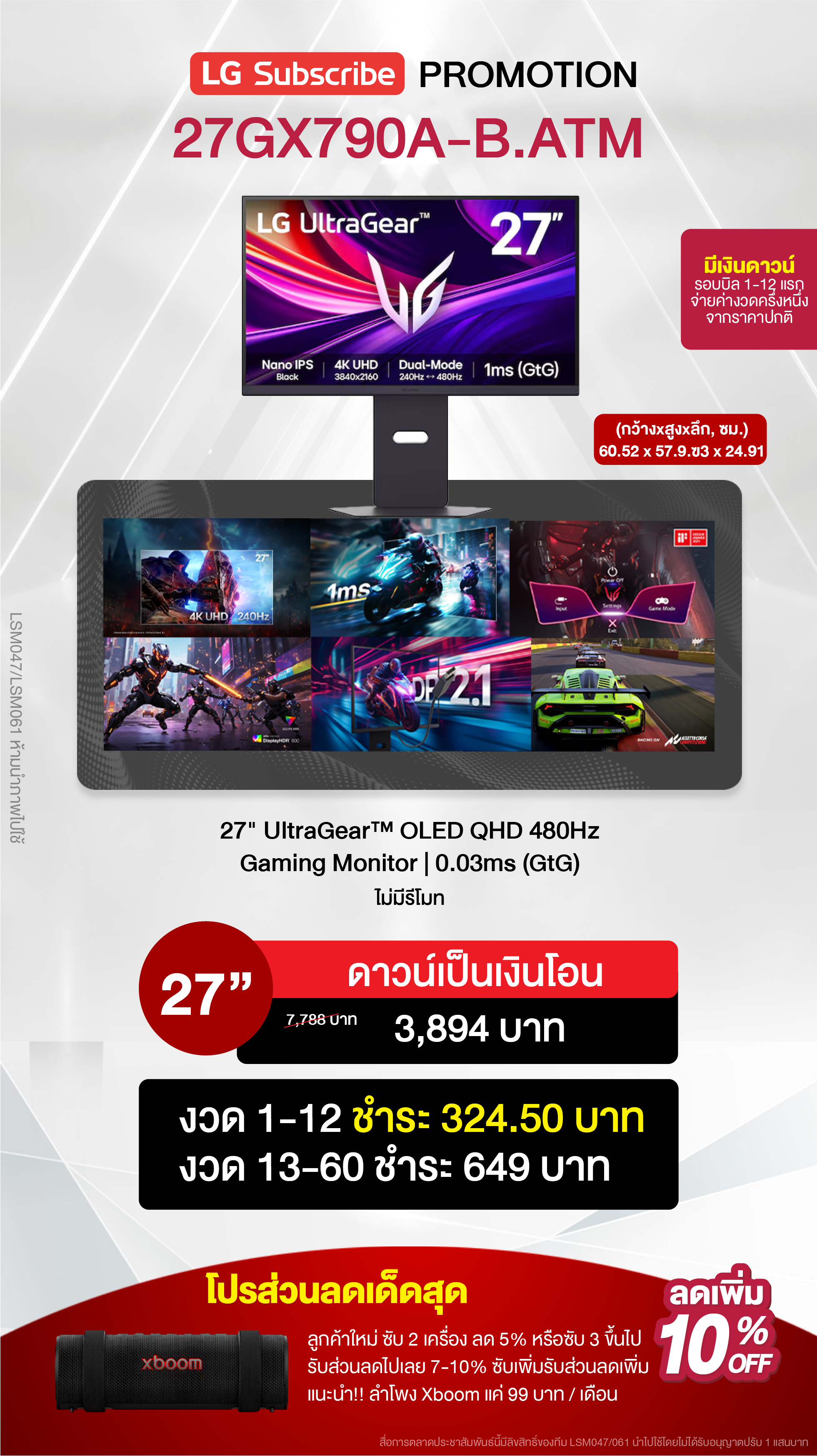 ค่างวดเริ่มต้นเพียง 4xx - 6xx บาทต่อเดือน อัตราดอกเบี้ย 0% นานสูงสุด 60 เดือน รองรับบัตรเครดิตที่วงเงินเหลือน้อยโดยไม่มีการปฏิเสธ ขยายระยะเวลาการรับประกันจาก 1 ปี เป็น 5-7 ปี บริการซ่อมแซมเครื่องโดยไม่มีค่าใช้จ่าย ฟรีค่าแรงและอะไหล่แท้ 100% ไม่มีค่าใช้จ่ายเพิ่มเติมในอนาคต เดือนแรกสามารถใช้งานได้โดยไม่มีค่าใช้จ่าย บริการติดตั้งฟรีโดยช่างจาก LG สิทธิพิเศษเพิ่มเติมอีกเพียบ