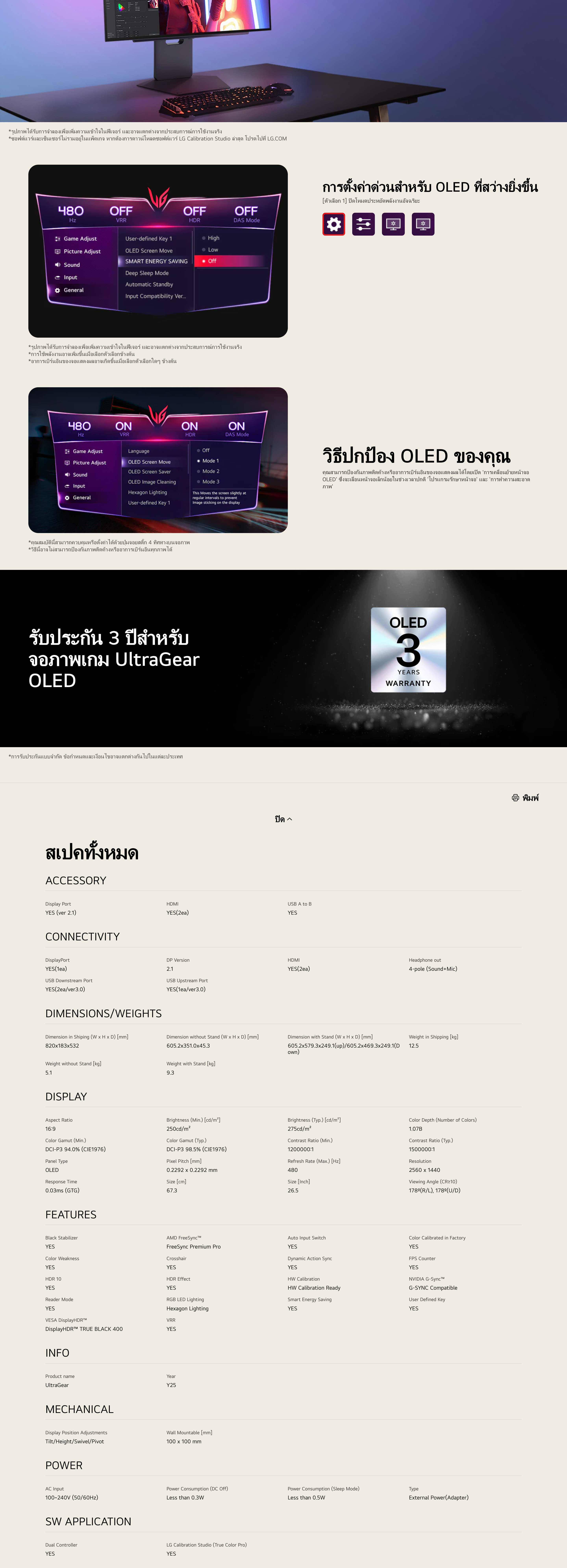 จอเกม OLED 26.5" QHD รีเฟรชสูงสุด 480Hz ตอบสนองไว 0.03ms รองรับ G-SYNC, FreeSync และ HDR True Black 400