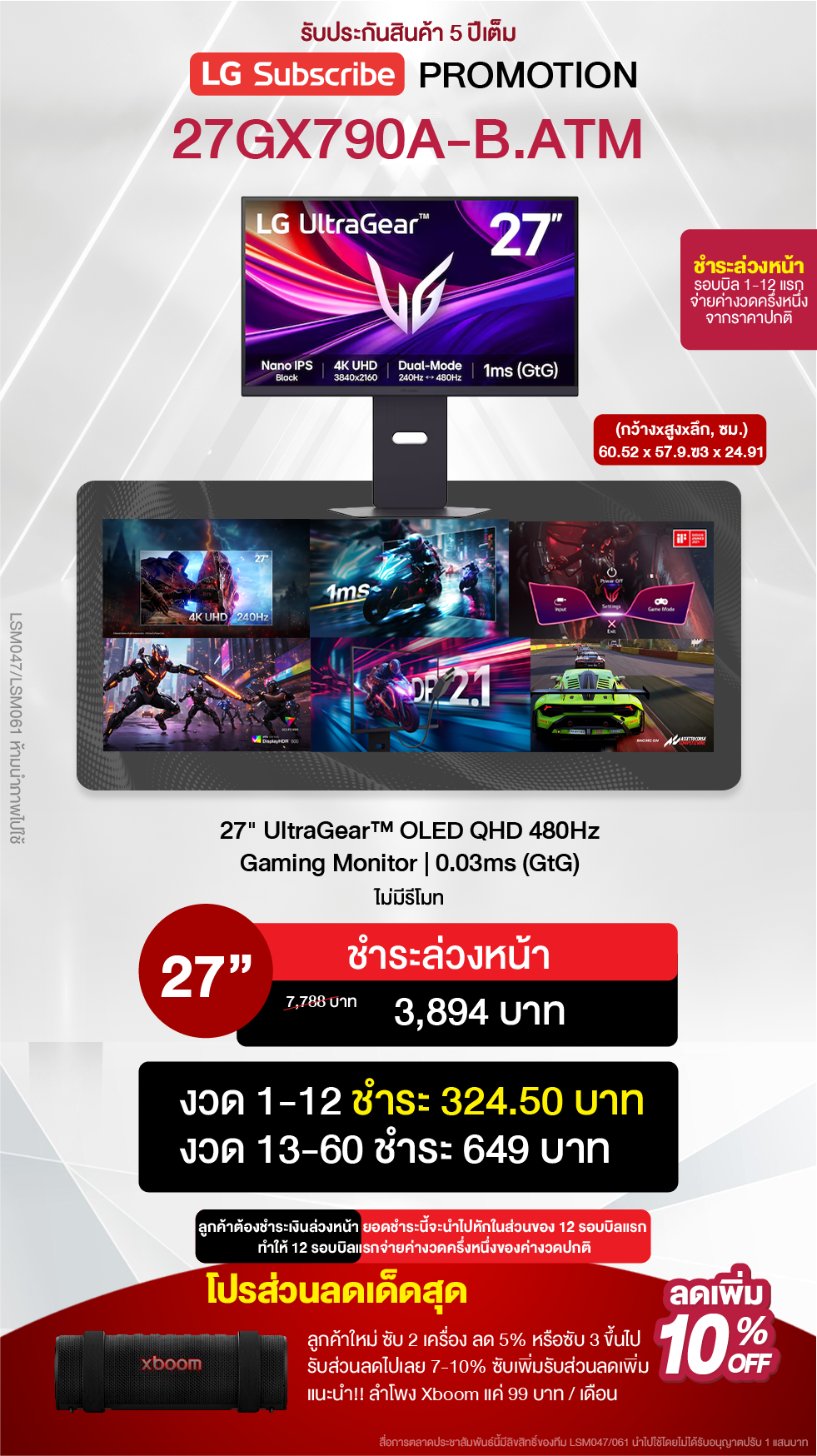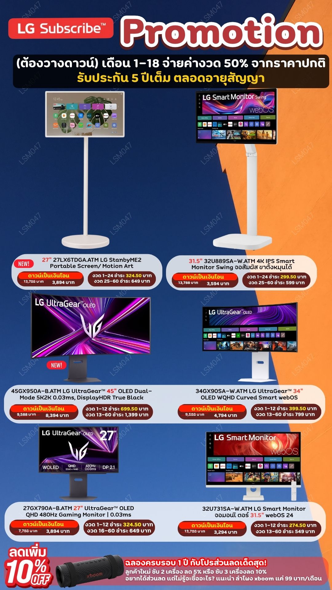 ค่างวดเริ่มต้นเพียง 4xx - 6xx บาทต่อเดือน อัตราดอกเบี้ย 0% นานสูงสุด 60 เดือน รองรับบัตรเครดิตที่วงเงินเหลือน้อยโดยไม่มีการปฏิเสธ ขยายระยะเวลาการรับประกันจาก 1 ปี เป็น 5-7 ปี บริการซ่อมแซมเครื่องโดยไม่มีค่าใช้จ่าย ฟรีค่าแรงและอะไหล่แท้ 100% ไม่มีค่าใช้จ่ายเพิ่มเติมในอนาคต เดือนแรกสามารถใช้งานได้โดยไม่มีค่าใช้จ่าย บริการติดตั้งฟรีโดยช่างจาก LG สิทธิพิเศษเพิ่มเติมอีกเพียบ