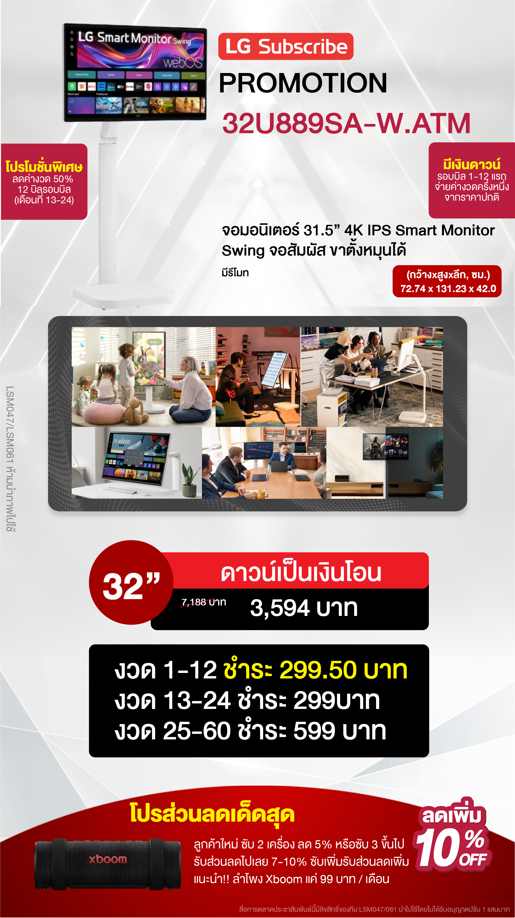 ค่างวดเริ่มต้นเพียง 4xx - 6xx บาทต่อเดือน อัตราดอกเบี้ย 0% นานสูงสุด 60 เดือน รองรับบัตรเครดิตที่วงเงินเหลือน้อยโดยไม่มีการปฏิเสธ ขยายระยะเวลาการรับประกันจาก 1 ปี เป็น 5-7 ปี บริการซ่อมแซมเครื่องโดยไม่มีค่าใช้จ่าย ฟรีค่าแรงและอะไหล่แท้ 100% ไม่มีค่าใช้จ่ายเพิ่มเติมในอนาคต เดือนแรกสามารถใช้งานได้โดยไม่มีค่าใช้จ่าย บริการติดตั้งฟรีโดยช่างจาก LG สิทธิพิเศษเพิ่มเติมอีกเพียบ