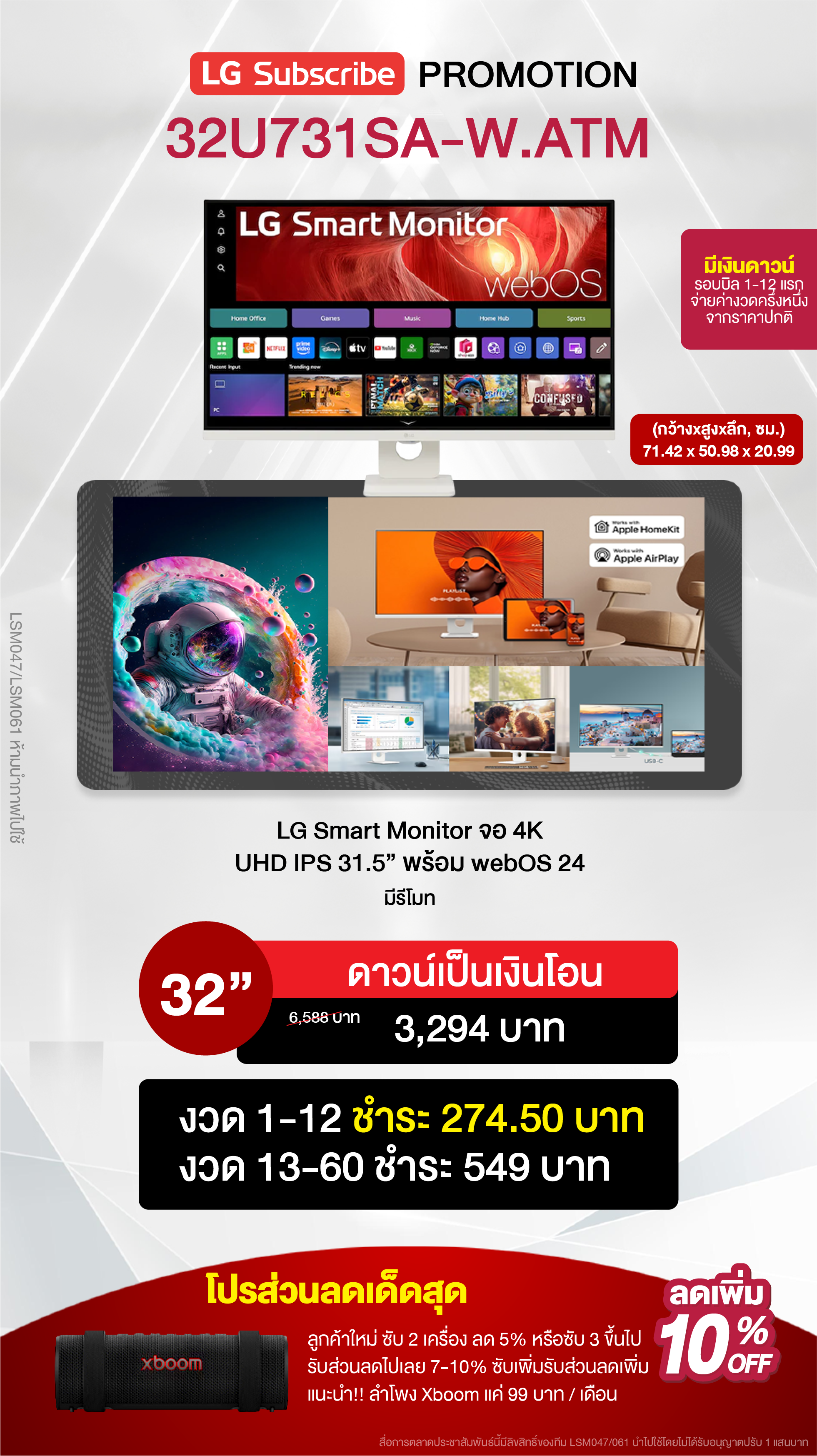ค่างวดเริ่มต้นเพียง 4xx - 6xx บาทต่อเดือน อัตราดอกเบี้ย 0% นานสูงสุด 60 เดือน รองรับบัตรเครดิตที่วงเงินเหลือน้อยโดยไม่มีการปฏิเสธ ขยายระยะเวลาการรับประกันจาก 1 ปี เป็น 5-7 ปี บริการซ่อมแซมเครื่องโดยไม่มีค่าใช้จ่าย ฟรีค่าแรงและอะไหล่แท้ 100% ไม่มีค่าใช้จ่ายเพิ่มเติมในอนาคต เดือนแรกสามารถใช้งานได้โดยไม่มีค่าใช้จ่าย บริการติดตั้งฟรีโดยช่างจาก LG สิทธิพิเศษเพิ่มเติมอีกเพียบ