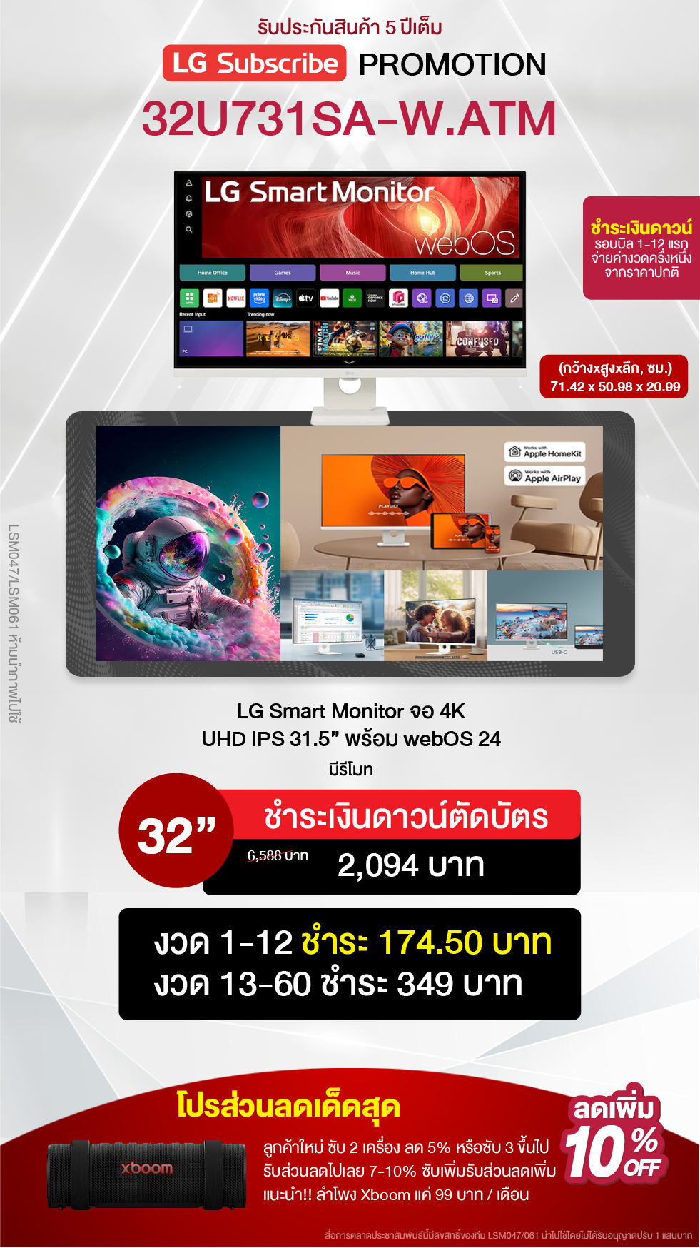 ค่างวดเริ่มต้นเพียง 4xx - 6xx บาทต่อเดือน อัตราดอกเบี้ย 0% นานสูงสุด 60 เดือน รองรับบัตรเครดิตที่วงเงินเหลือน้อยโดยไม่มีการปฏิเสธ ขยายระยะเวลาการรับประกันจาก 1 ปี เป็น 5-7 ปี บริการซ่อมแซมเครื่องโดยไม่มีค่าใช้จ่าย ฟรีค่าแรงและอะไหล่แท้ 100% ไม่มีค่าใช้จ่ายเพิ่มเติมในอนาคต เดือนแรกสามารถใช้งานได้โดยไม่มีค่าใช้จ่าย บริการติดตั้งฟรีโดยช่างจาก LG สิทธิพิเศษเพิ่มเติมอีกเพียบ