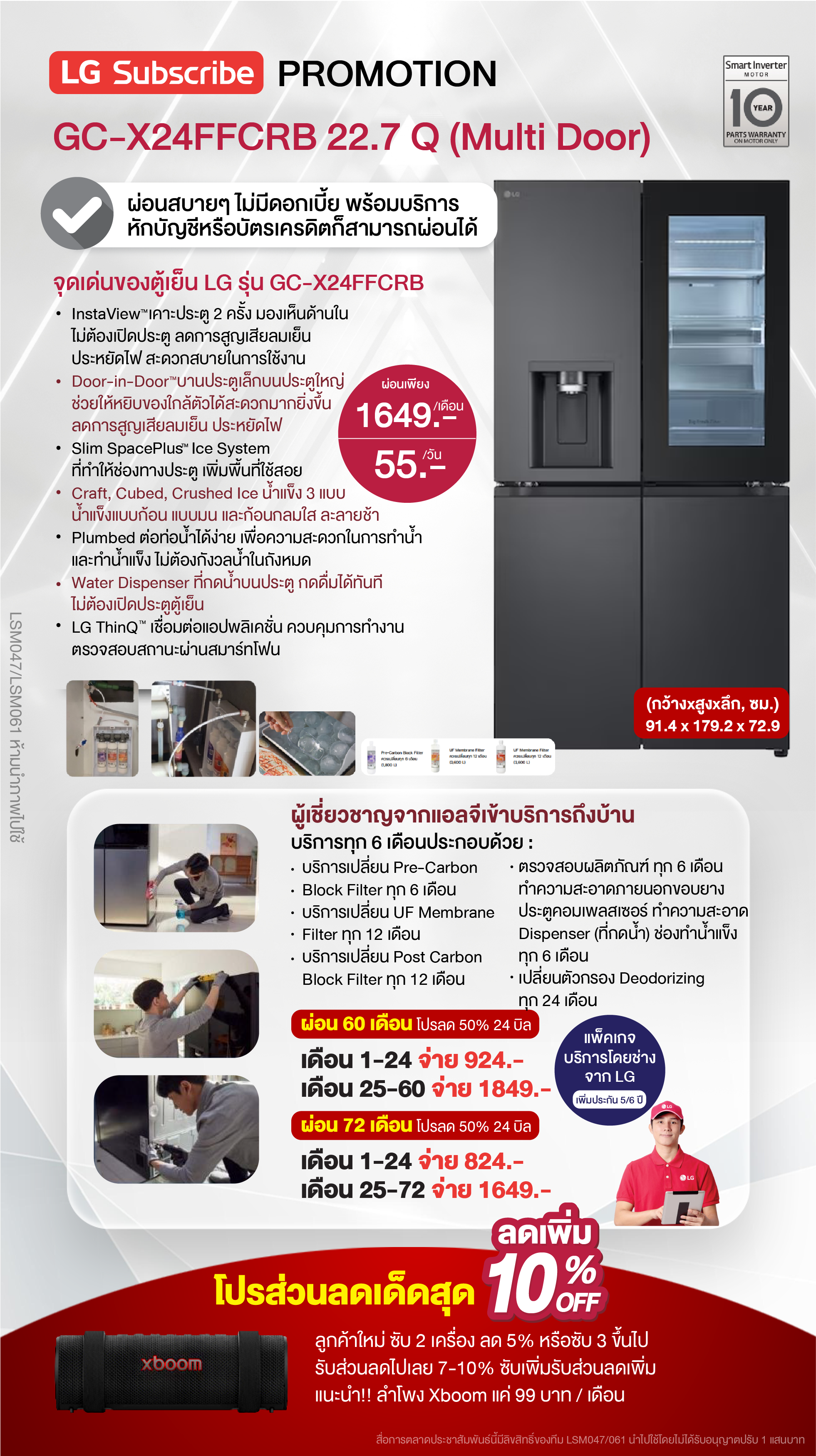 ค่างวดเริ่มต้นเพียง 4xx - 6xx บาทต่อเดือน อัตราดอกเบี้ย 0% นานสูงสุด 60 เดือน รองรับบัตรเครดิตที่วงเงินเต็มโดยไม่มีการปฏิเสธ ขยายระยะเวลาการรับประกันจาก 1 ปี เป็น 5-7 ปี บริการซ่อมแซมเครื่องโดยไม่มีค่าใช้จ่าย ฟรีค่าแรงและอะไหล่แท้ 100% ไม่มีค่าใช้จ่ายเพิ่มเติมในอนาคต เดือนแรกสามารถใช้งานได้โดยไม่มีค่าใช้จ่าย บริการติดตั้งฟรีโดยช่างจาก LG สิทธิพิเศษเพิ่มเติมอีกเพียบ