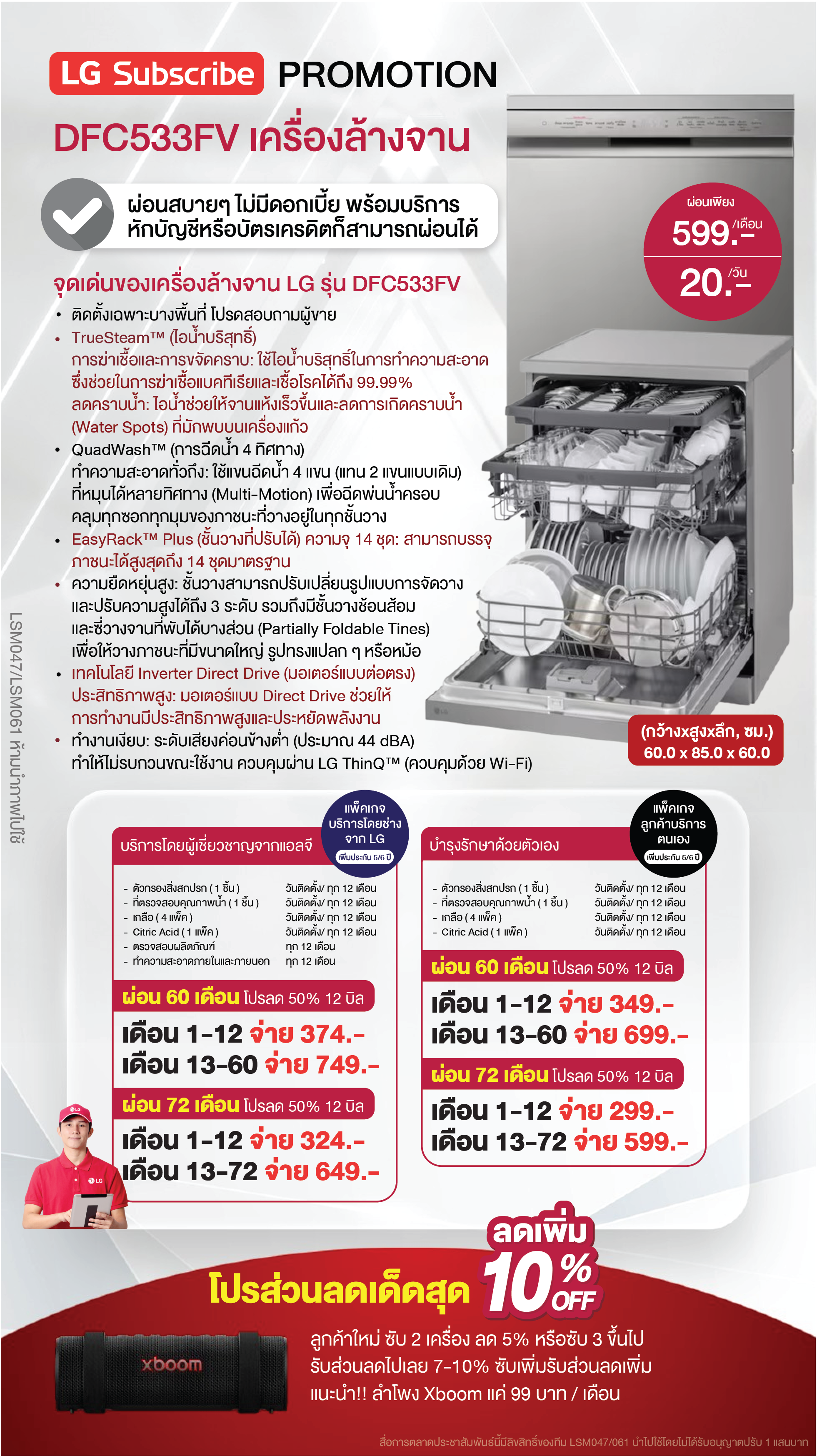 ค่างวดเริ่มต้นเพียง 4xx - 6xx บาทต่อเดือน อัตราดอกเบี้ย 0% นานสูงสุด 60 เดือน รองรับบัตรเครดิตที่วงเงินเหลือน้อยโดยไม่มีการปฏิเสธ ขยายระยะเวลาการรับประกันจาก 1 ปี เป็น 5-7 ปี บริการซ่อมแซมเครื่องโดยไม่มีค่าใช้จ่าย ฟรีค่าแรงและอะไหล่แท้ 100% ไม่มีค่าใช้จ่ายเพิ่มเติมในอนาคต เดือนแรกสามารถใช้งานได้โดยไม่มีค่าใช้จ่าย บริการติดตั้งฟรีโดยช่างจาก LG สิทธิพิเศษเพิ่มเติมอีกเพียบ