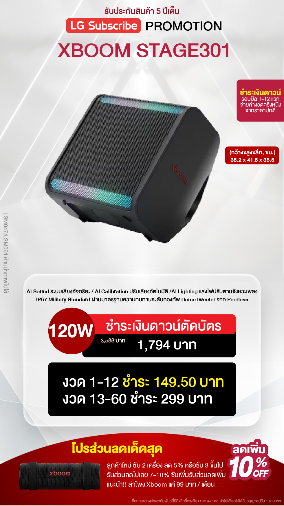 ค่างวดเริ่มต้นเพียง 4xx - 6xx บาทต่อเดือน อัตราดอกเบี้ย 0% นานสูงสุด 60 เดือน รองรับบัตรเครดิตที่วงเงินเหลือน้อยโดยไม่มีการปฏิเสธ ขยายระยะเวลาการรับประกันจาก 1 ปี เป็น 5-7 ปี บริการซ่อมแซมเครื่องโดยไม่มีค่าใช้จ่าย ฟรีค่าแรงและอะไหล่แท้ 100% ไม่มีค่าใช้จ่ายเพิ่มเติมในอนาคต เดือนแรกสามารถใช้งานได้โดยไม่มีค่าใช้จ่าย บริการติดตั้งฟรีโดยช่างจาก LG สิทธิพิเศษเพิ่มเติมอีกเพียบ