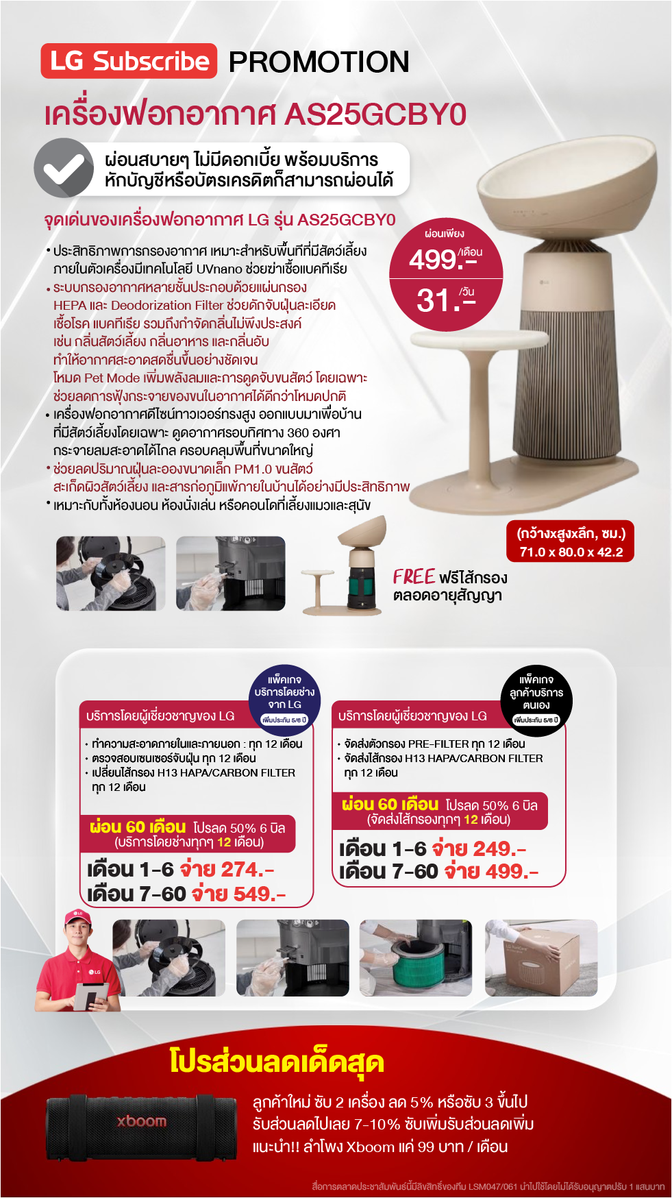 ค่างวดเริ่มต้นเพียง 4xx - 6xx บาทต่อเดือน อัตราดอกเบี้ย 0% นานสูงสุด 60 เดือน รองรับบัตรเครดิตที่วงเงินเหลือน้อยโดยไม่มีการปฏิเสธ ขยายระยะเวลาการรับประกันจาก 1 ปี เป็น 5-7 ปี บริการซ่อมแซมเครื่องโดยไม่มีค่าใช้จ่าย ฟรีค่าแรงและอะไหล่แท้ 100% ไม่มีค่าใช้จ่ายเพิ่มเติมในอนาคต เดือนแรกสามารถใช้งานได้โดยไม่มีค่าใช้จ่าย บริการติดตั้งฟรีโดยช่างจาก LG สิทธิพิเศษเพิ่มเติมอีกเพียบ