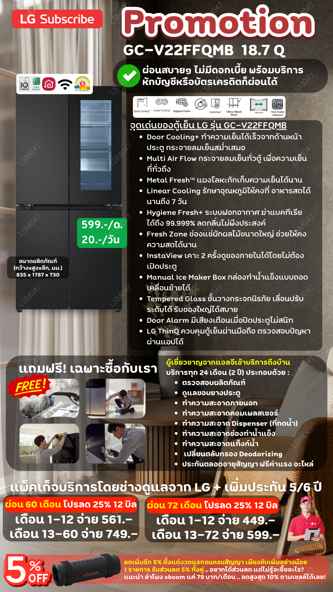 ค่างวดเริ่มต้นเพียง 4xx - 6xx บาทต่อเดือน อัตราดอกเบี้ย 0% นานสูงสุด 60 เดือน รองรับบัตรเครดิตที่วงเงินเต็มโดยไม่มีการปฏิเสธ ขยายระยะเวลาการรับประกันจาก 1 ปี เป็น 5-7 ปี บริการซ่อมแซมเครื่องโดยไม่มีค่าใช้จ่าย ฟรีค่าแรงและอะไหล่แท้ 100% ไม่มีค่าใช้จ่ายเพิ่มเติมในอนาคต เดือนแรกสามารถใช้งานได้โดยไม่มีค่าใช้จ่าย บริการติดตั้งฟรีโดยช่างจาก LG สิทธิพิเศษเพิ่มเติมอีกเพียบ ดูเพิ่มเติมเกี่ยวกับการผ่อนรายเดือน