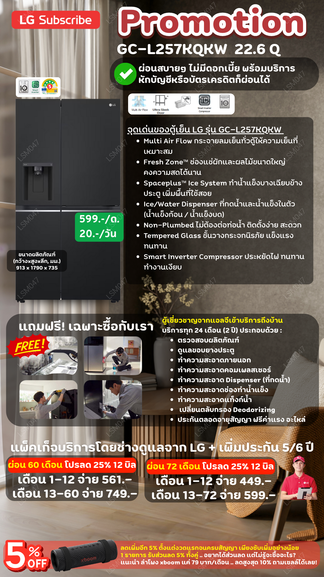 ค่างวดเริ่มต้นเพียง 4xx - 6xx บาทต่อเดือน อัตราดอกเบี้ย 0% นานสูงสุด 60 เดือน รองรับบัตรเครดิตที่วงเงินเต็มโดยไม่มีการปฏิเสธ ขยายระยะเวลาการรับประกันจาก 1 ปี เป็น 5-7 ปี บริการซ่อมแซมเครื่องโดยไม่มีค่าใช้จ่าย ฟรีค่าแรงและอะไหล่แท้ 100% ไม่มีค่าใช้จ่ายเพิ่มเติมในอนาคต เดือนแรกสามารถใช้งานได้โดยไม่มีค่าใช้จ่าย บริการติดตั้งฟรีโดยช่างจาก LG สิทธิพิเศษเพิ่มเติมอีกเพียบ ดูเพิ่มเติมการผ่อนรายเดือน