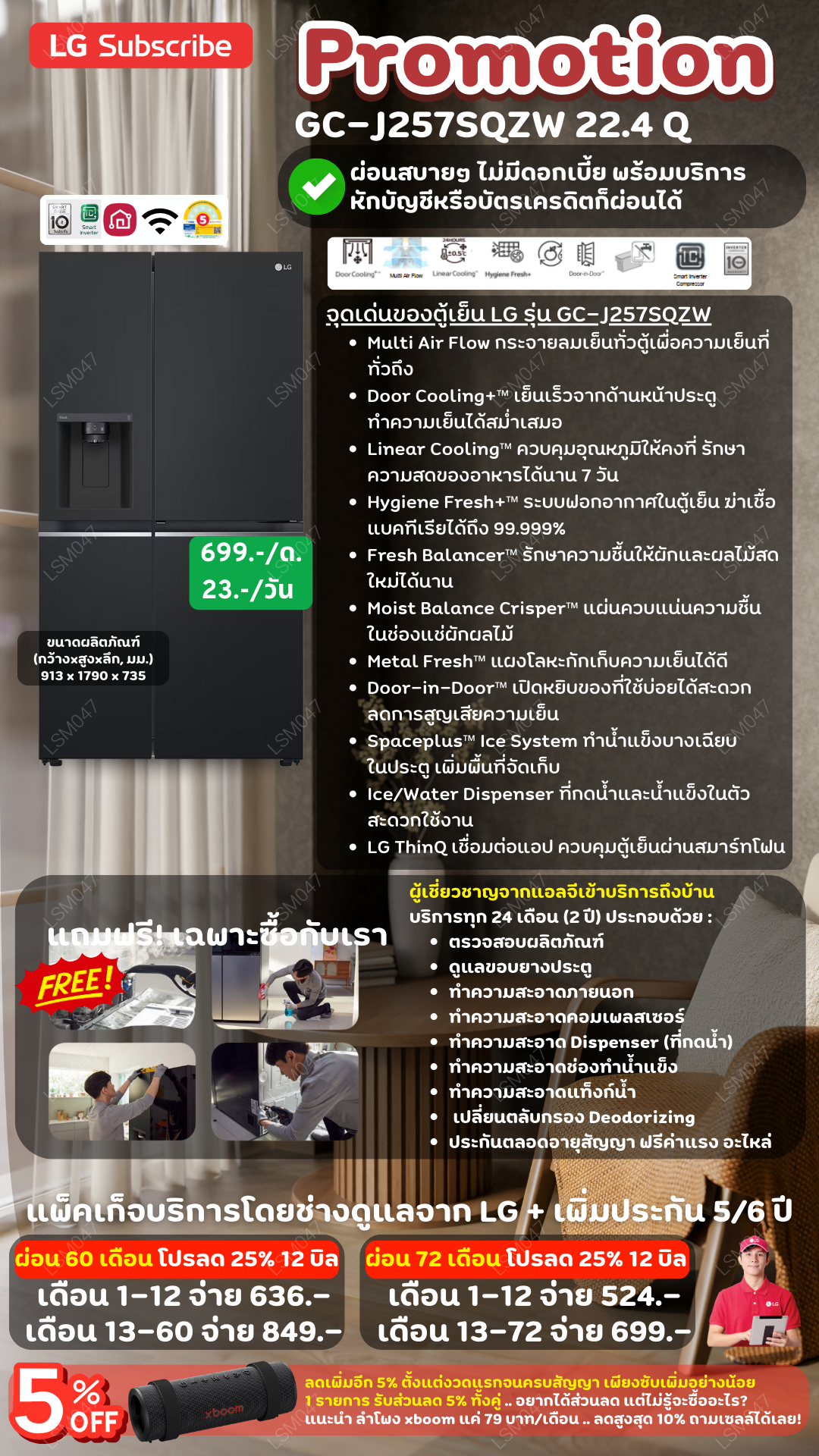 ค่างวดเริ่มต้นเพียง 4xx - 6xx บาทต่อเดือน อัตราดอกเบี้ย 0% นานสูงสุด 60 เดือน รองรับบัตรเครดิตที่วงเงินเต็มโดยไม่มีการปฏิเสธ ขยายระยะเวลาการรับประกันจาก 1 ปี เป็น 5-7 ปี บริการซ่อมแซมเครื่องโดยไม่มีค่าใช้จ่าย ฟรีค่าแรงและอะไหล่แท้ 100% ไม่มีค่าใช้จ่ายเพิ่มเติมในอนาคต เดือนแรกสามารถใช้งานได้โดยไม่มีค่าใช้จ่าย บริการติดตั้งฟรีโดยช่างจาก LG สิทธิพิเศษเพิ่มเติมอีกเพียบ ดูเพิ่มเติมการผ่อนรายเดือน