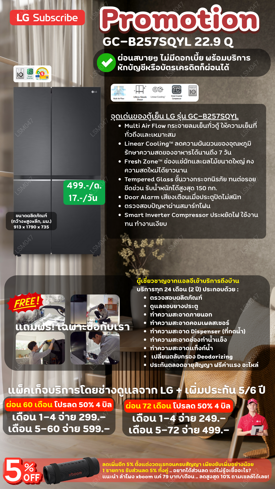 ค่างวดเริ่มต้นเพียง 4xx - 6xx บาทต่อเดือน อัตราดอกเบี้ย 0% นานสูงสุด 60 เดือน รองรับบัตรเครดิตที่วงเงินเต็มโดยไม่มีการปฏิเสธ ขยายระยะเวลาการรับประกันจาก 1 ปี เป็น 5-7 ปี บริการซ่อมแซมเครื่องโดยไม่มีค่าใช้จ่าย ฟรีค่าแรงและอะไหล่แท้ 100% ไม่มีค่าใช้จ่ายเพิ่มเติมในอนาคต เดือนแรกสามารถใช้งานได้โดยไม่มีค่าใช้จ่าย บริการติดตั้งฟรีโดยช่างจาก LG สิทธิพิเศษเพิ่มเติมอีกเพียบ ดูเพิ่มเติมการผ่อนรายเดือน