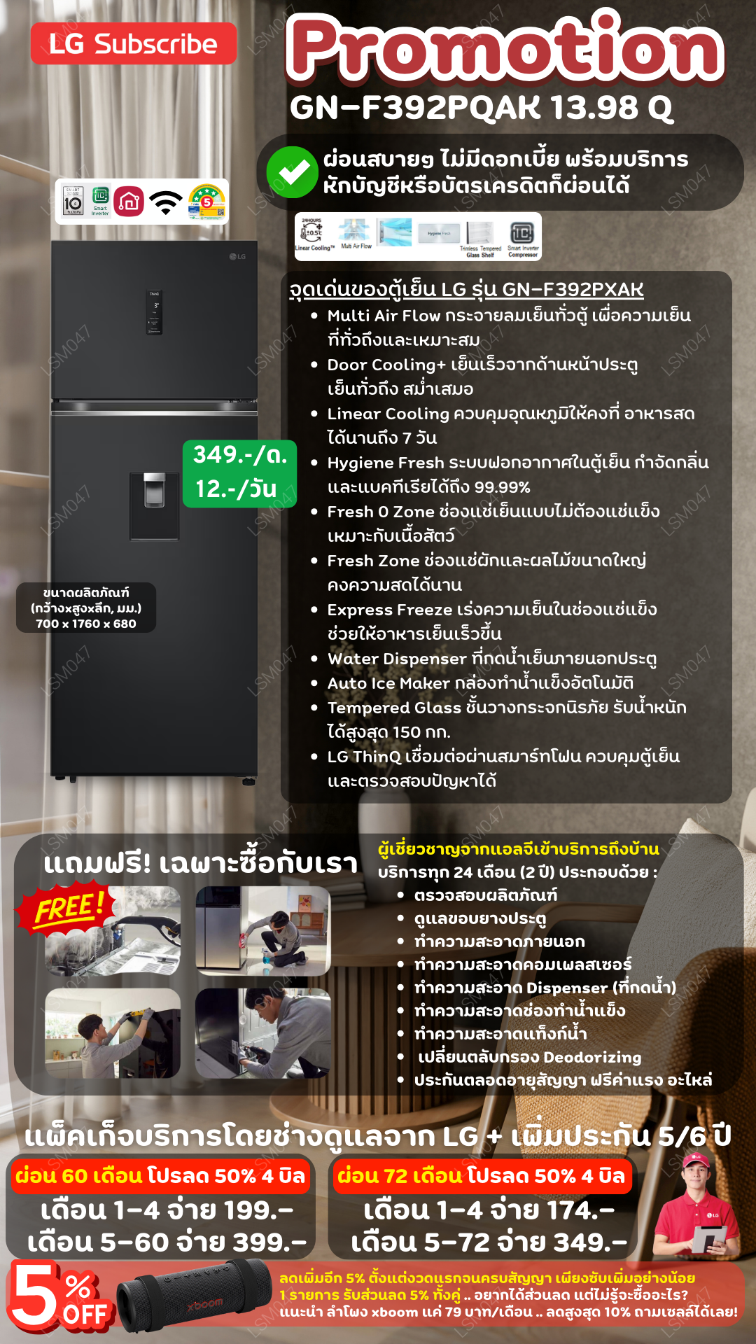 ค่างวดเริ่มต้นเพียง 4xx - 6xx บาทต่อเดือน อัตราดอกเบี้ย 0% นานสูงสุด 60 เดือน รองรับบัตรเครดิตที่วงเงินเต็มโดยไม่มีการปฏิเสธ ขยายระยะเวลาการรับประกันจาก 1 ปี เป็น 5-7 ปี บริการซ่อมแซมเครื่องโดยไม่มีค่าใช้จ่าย ฟรีค่าแรงและอะไหล่แท้ 100% ไม่มีค่าใช้จ่ายเพิ่มเติมในอนาคต เดือนแรกสามารถใช้งานได้โดยไม่มีค่าใช้จ่าย บริการติดตั้งฟรีโดยช่างจาก LG สิทธิพิเศษเพิ่มเติมอีกเพียบ ดูเพิ่มเติมการผ่อนรายเดือน